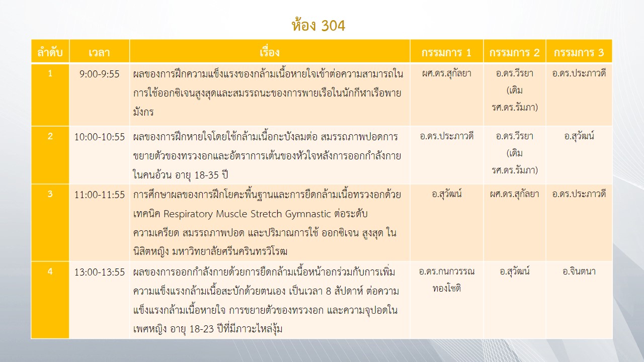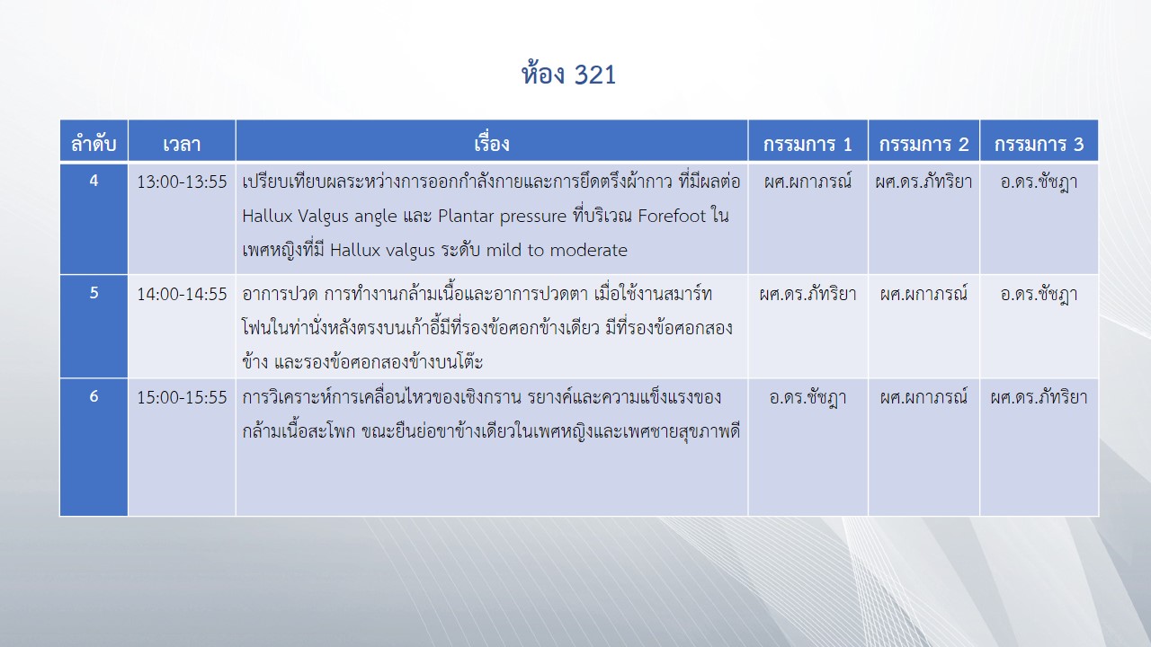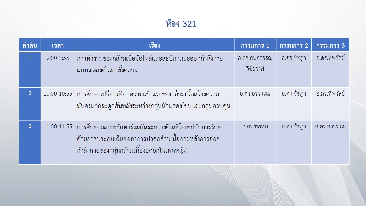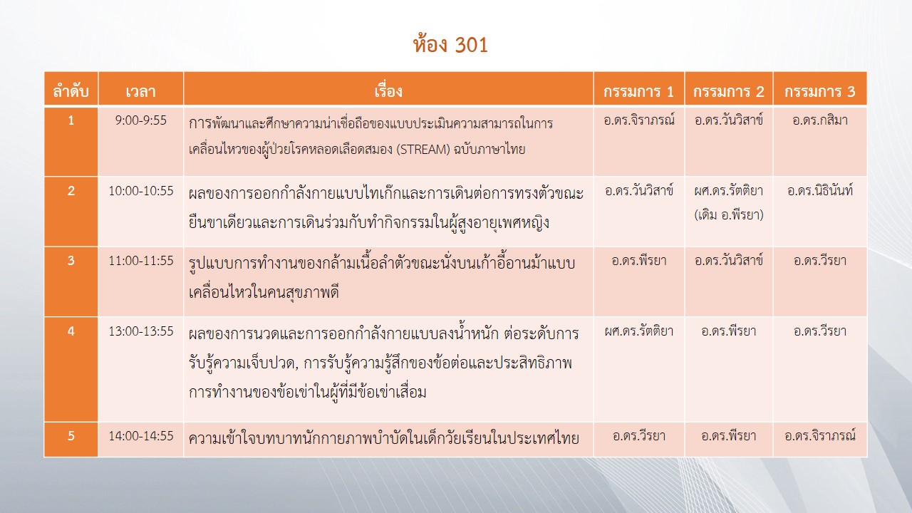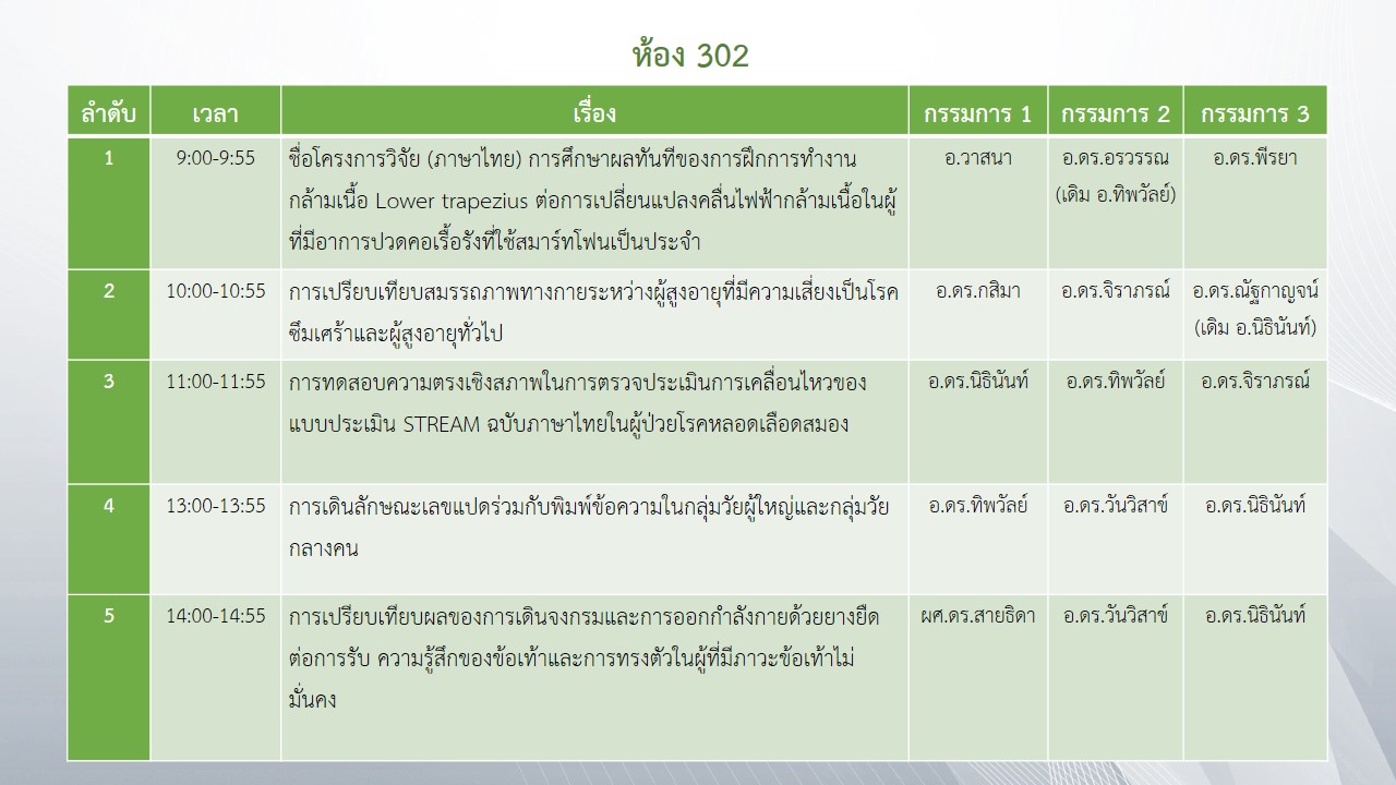 ขอเชิญนิสิตสาขากายภาพบำบัดปี 1- 3 เข้าฟังการนำเสนอผลงานวิจัยของนิสิตกายภาพบำบัด ชั้นปีที่ 4 ในวันจันทร์ที่ 8 พฤษภาคม 2560 ณ อาคารคณะกายภาพบำบัด มศว ห้อง 301 , 302 , 304 และ 321 เวลา 09.00 - 16.30 น.