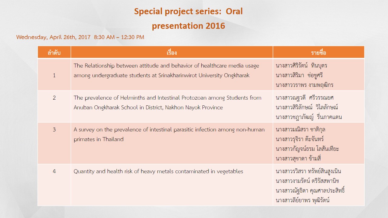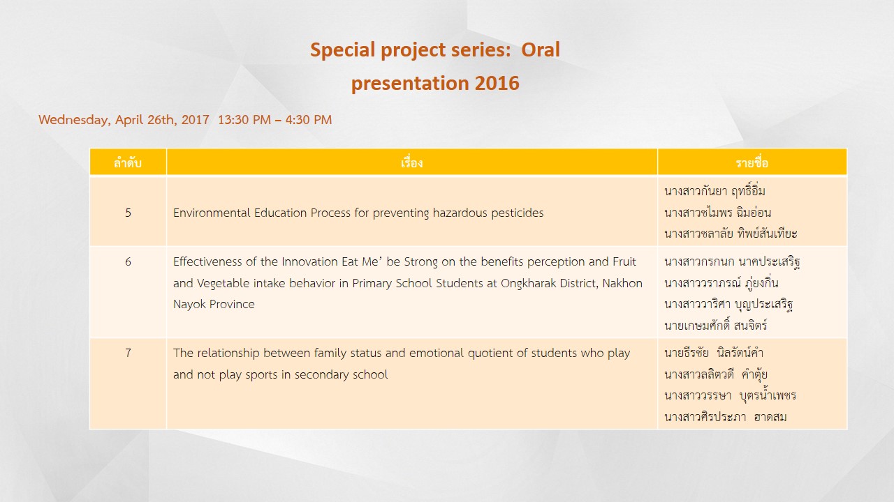 ขอเชิญนิสิตสาขาการส่งเสริมสุขภาพ ปี 1- 3 เข้าฟังการนำเสนอผลงานวิจัยของนิสิตสาขาการส่งเสริมสุขภาพ ชั้นปีที่ 4 ในวันพุธที่ 26 เมษายน 2560 ณ อาคารคณะกายภาพบำบัด มศว ห้อง 307 เวลา 08.30 - 16.30 น.