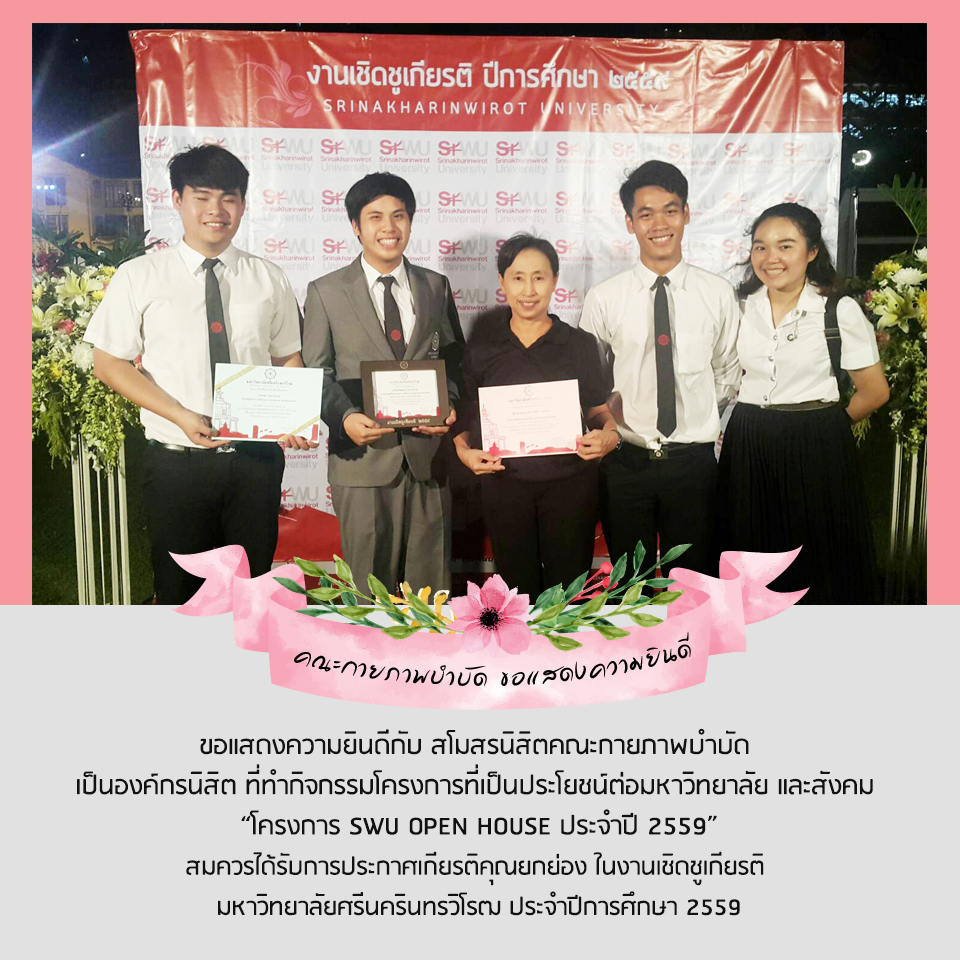 ขอแสดงความยินดีกับ ผศ.ดร.รัตติยา จินเดหวา และองค์กรนิสิตคณะกายภาพบำบัด ได้รับประกาศเกียรติคุณในงานเชิดชูเกียรติ มหาวิทยาลัยศรีนครินทรวิโรฒ ประจำปีการศึกษา 2559