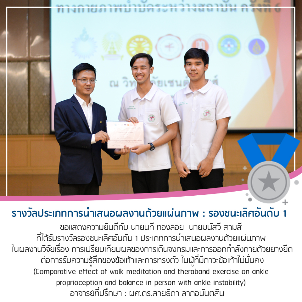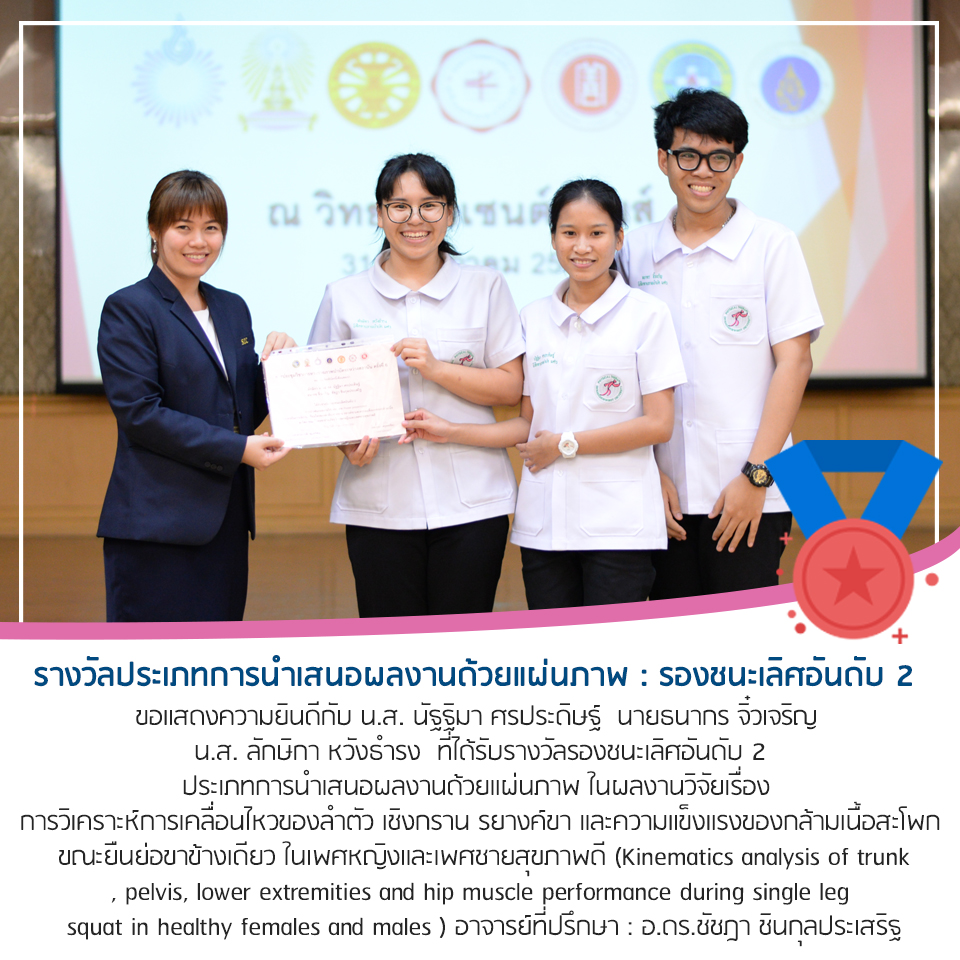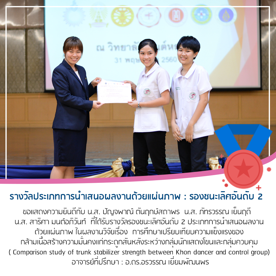 ที่ได้รับรางวัลรองชนะเลิศอันดับ 1 และรางวัลรองชนะเลิศอันดับ 2 ประเภทการนำเสนอผลงานด้วยแผ่นภาพ และประเภทการนำเสนอผลงานด้วยวาจา รวมทั้งหมด 7 รางวัล ในงานประชุมวิชาการทางกายภาพบำบัดระหว่างสถาบัน ครั้งที่ 6 เมื่อวันที่ 31 พฤษภาคม 2560 ณ วิทยาลัยเซนต์หลุยส์