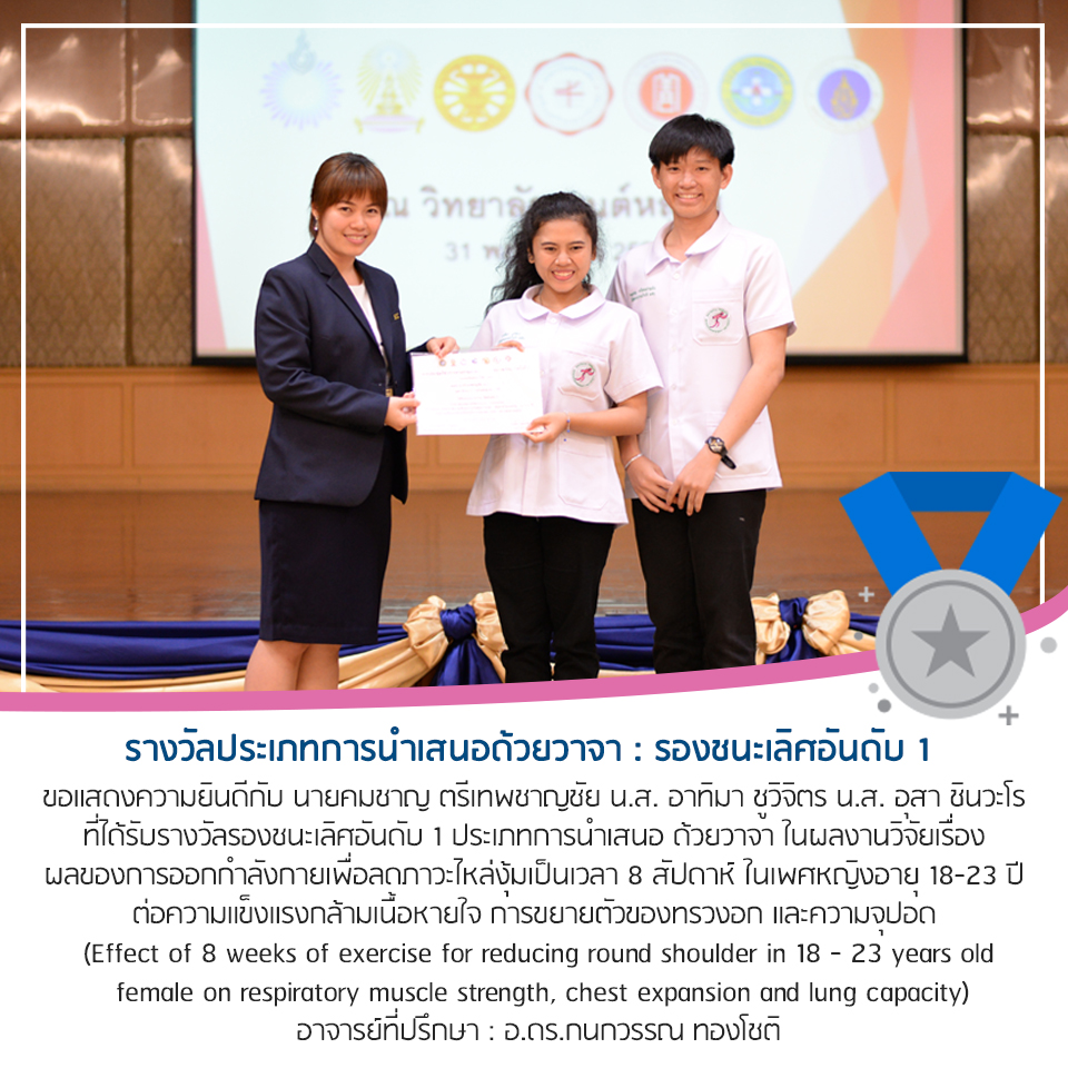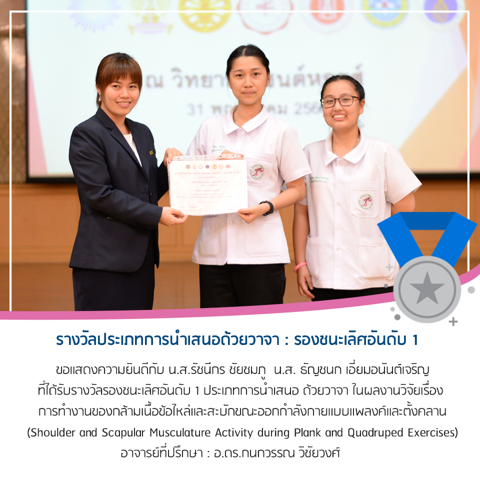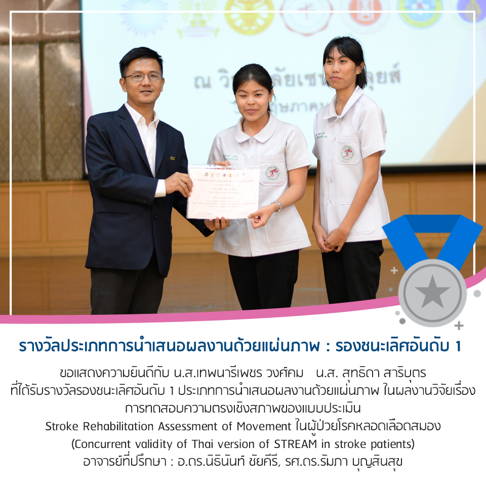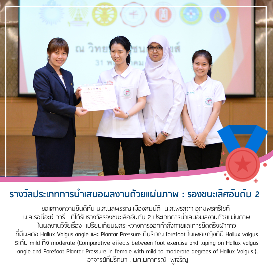 ที่ได้รับรางวัลรองชนะเลิศอันดับ 1 และรางวัลรองชนะเลิศอันดับ 2 ประเภทการนำเสนอผลงานด้วยแผ่นภาพ และประเภทการนำเสนอผลงานด้วยวาจา รวมทั้งหมด 7 รางวัล ในงานประชุมวิชาการทางกายภาพบำบัดระหว่างสถาบัน ครั้งที่ 6 เมื่อวันที่ 31 พฤษภาคม 2560 ณ วิทยาลัยเซนต์หลุยส์
