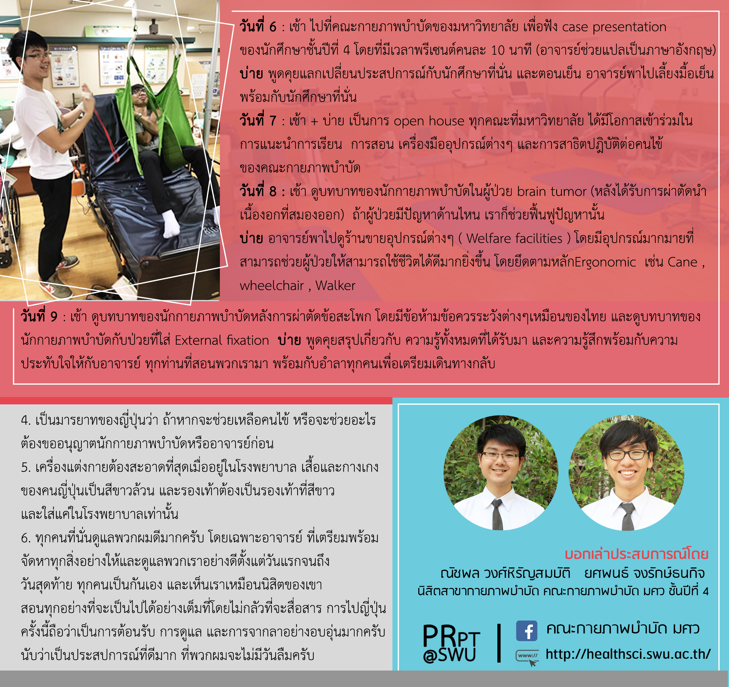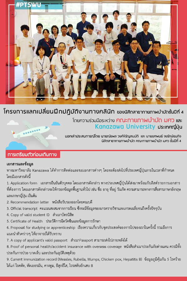 ประสบการณ์การเข้าร่วมโครงการแลกเปลี่ยนฝึกปฏิบัติงานทางคลินิก ของนิสิตสาขากายภาพบำบัดชั้นปีที่ 4 โดยความร่วมมือระหว่าง คณะกายภาพบำบัด มศว และ Kanazawa University ประเทศญี่ปุ่น