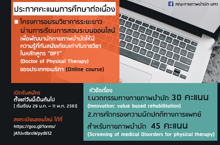 คณะกายภาพบำบัด มศว กำหนดจัดโครงการอบรมวิชาการระยะยาวเพื่อพัฒนานักกายภาพบำบัดให้มีความรู้ที่ทันสมัยเทียบเท่ากับรายวิชาในหลักสูตร “DPT” (Doctor of Physical Therapy) ของประเทศอเมริกา (Online course)
