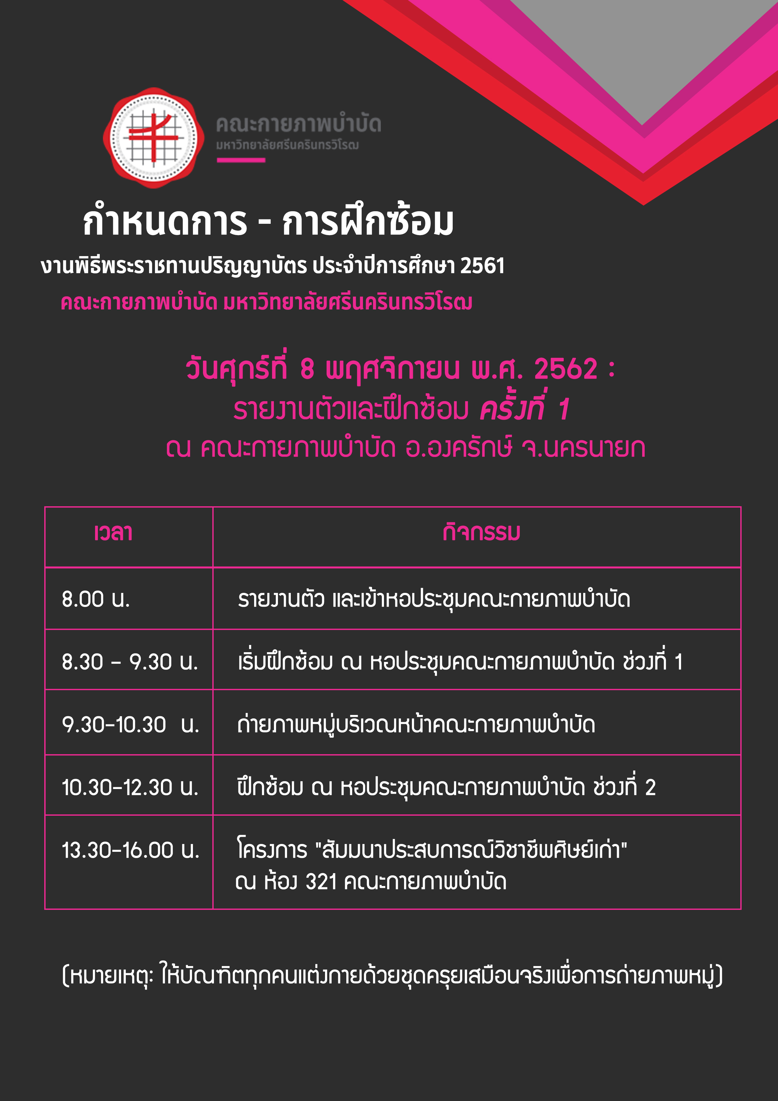 *****กำหนดการวันฝึกซ้อม 8 พ.ย. 2562 ณ คณะกายภาพบำบัด มศว ดูได้ที่ไฟล์แนบ ด้านล่าง
