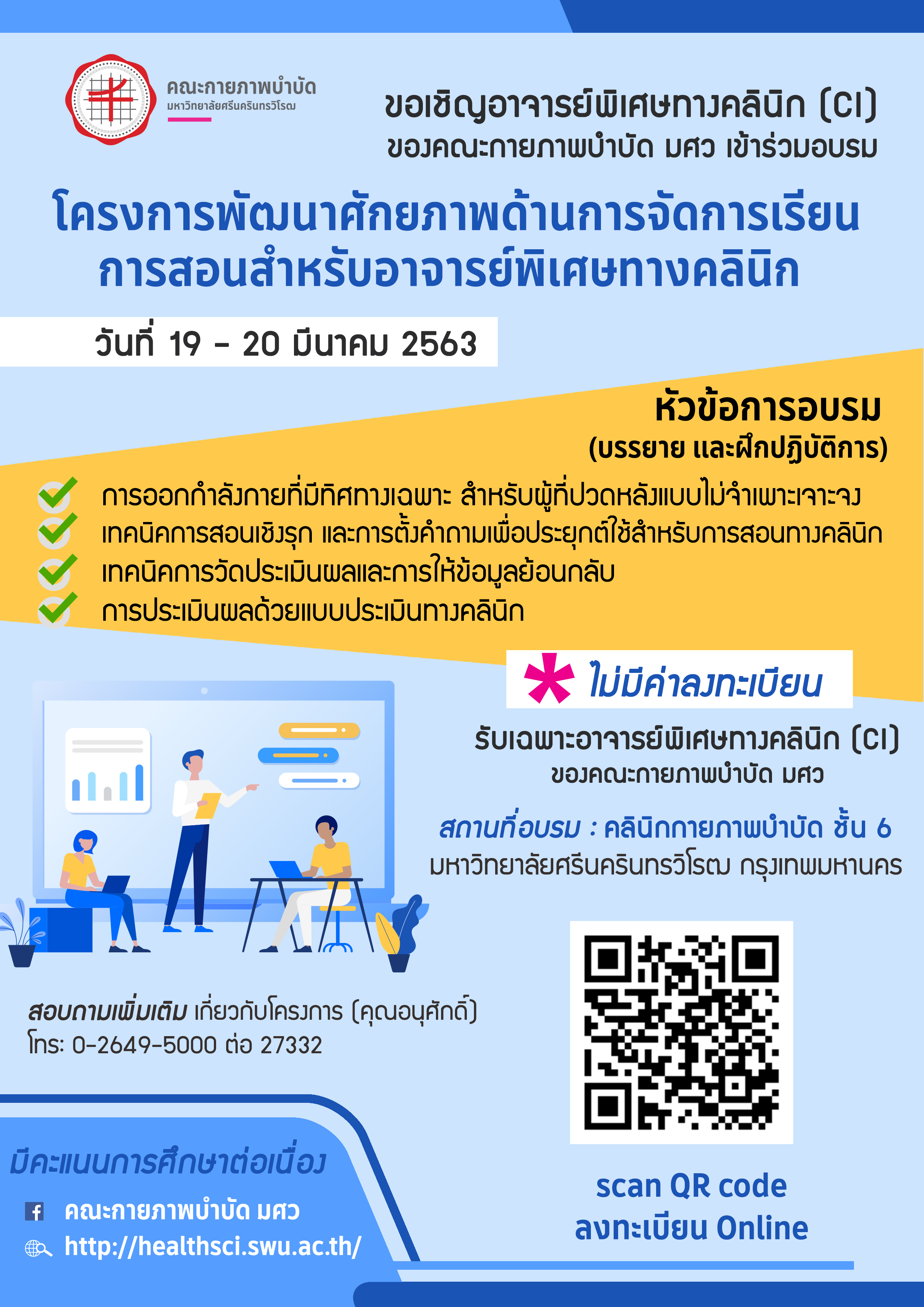 คณะกายภาพบำบัด มศว ขอเชิญนักกายภาพบำบัด ที่เป็นอาจารย์พิเศษทางคลินิก (CI) ของคณะกายภาพบำบัด มศว เข้าร่วมโครงการพัฒนาศักยภาพด้านการจัดการเรียนการสอนสำหรับอาจารย์พิเศษทางคลินิก
