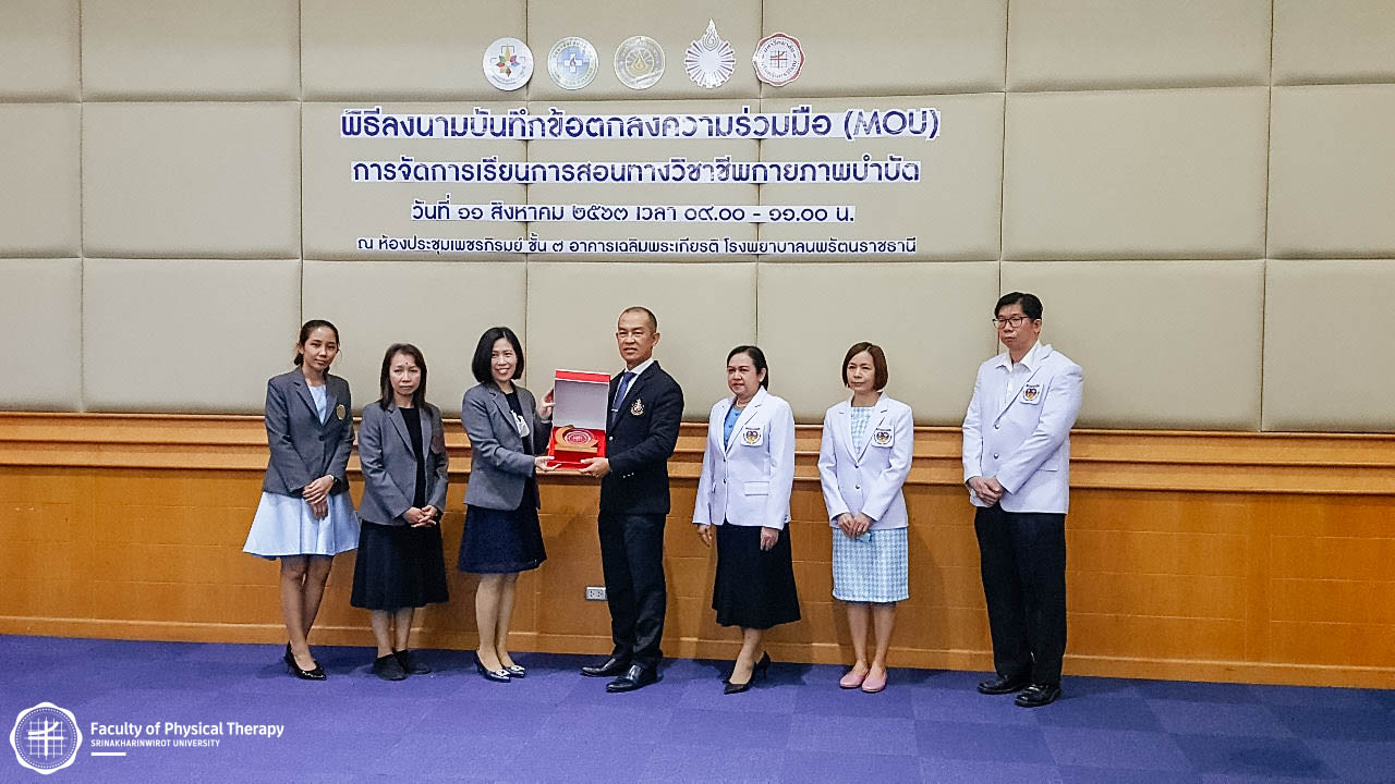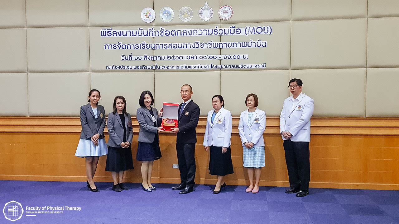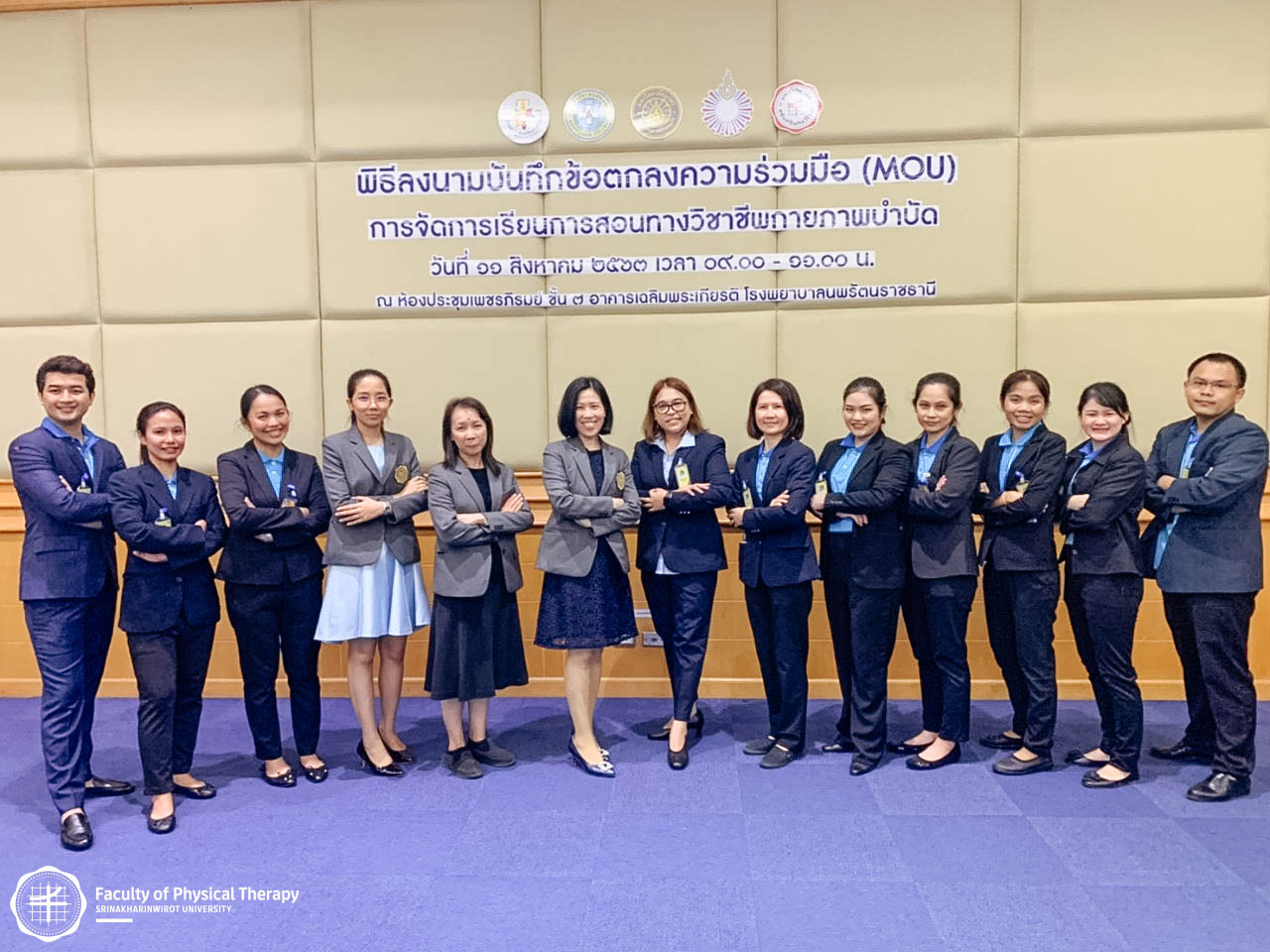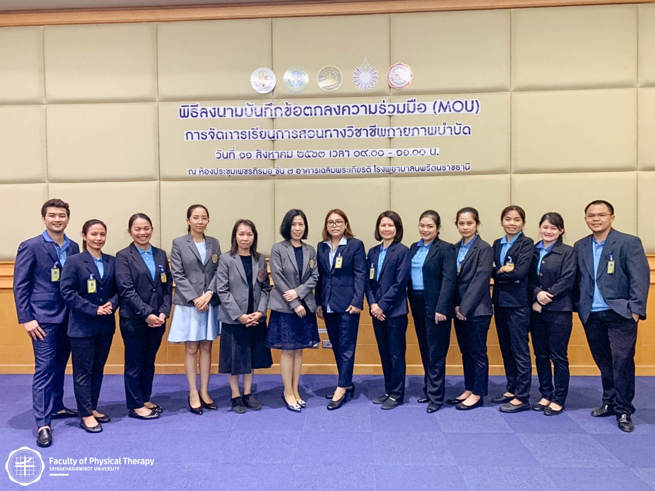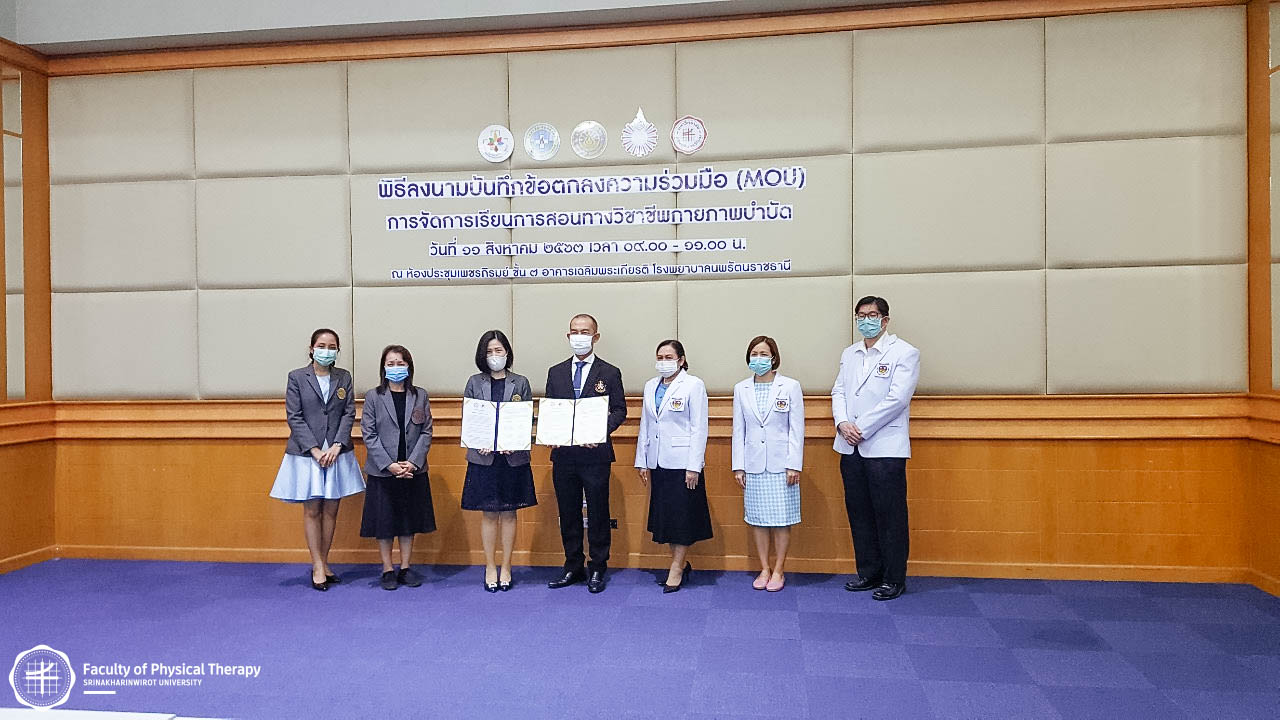 11 สิงหาคม 2563 รศ.ดร.รัมภา บุญสินสุข คณบดีคณะกายภาพบำบัด มหาวิทยาลัยศรีนครินทรวิโรฒ และคณาจารย์ได้เข้าร่วมพิธีลงนามบันทึกข้อตกลงความร่วมมือ (MOU) การจัดการเรียนการสอนทางวิชาชีพกายภาพบำบัด ระหว่างคณะกายภาพบำบัด มศว และโรงพยาบาลนพรัตนราชธานี ณ ห้องประชุมเพชรภิรมย์ ชั้น 7 อาคารเฉลิมพระเกียรติ โรงพยาบาลนพรัตนราชธานี