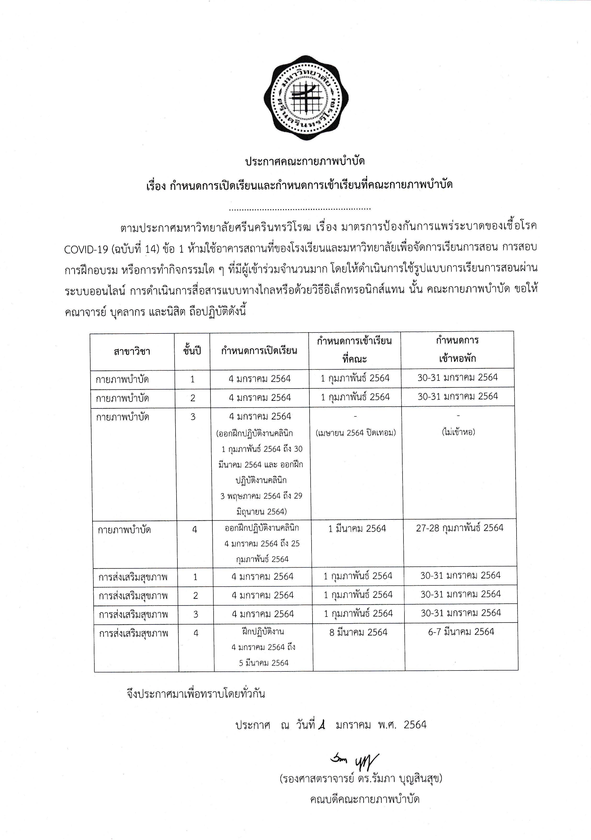 ข่าวประชาสัมพันธ์ ประกาศคณะกายภาพบำบัด เรื่องกำหนดการเปิดเรียนและกำหนดการเข้าเรียนที่คณะกายภาพบำบัด ประกาศ ณ วันที่ 4 มกราคม 2564 วันเริ่ม 2021-01-03 วันสิ้นสุด 2021-01-03