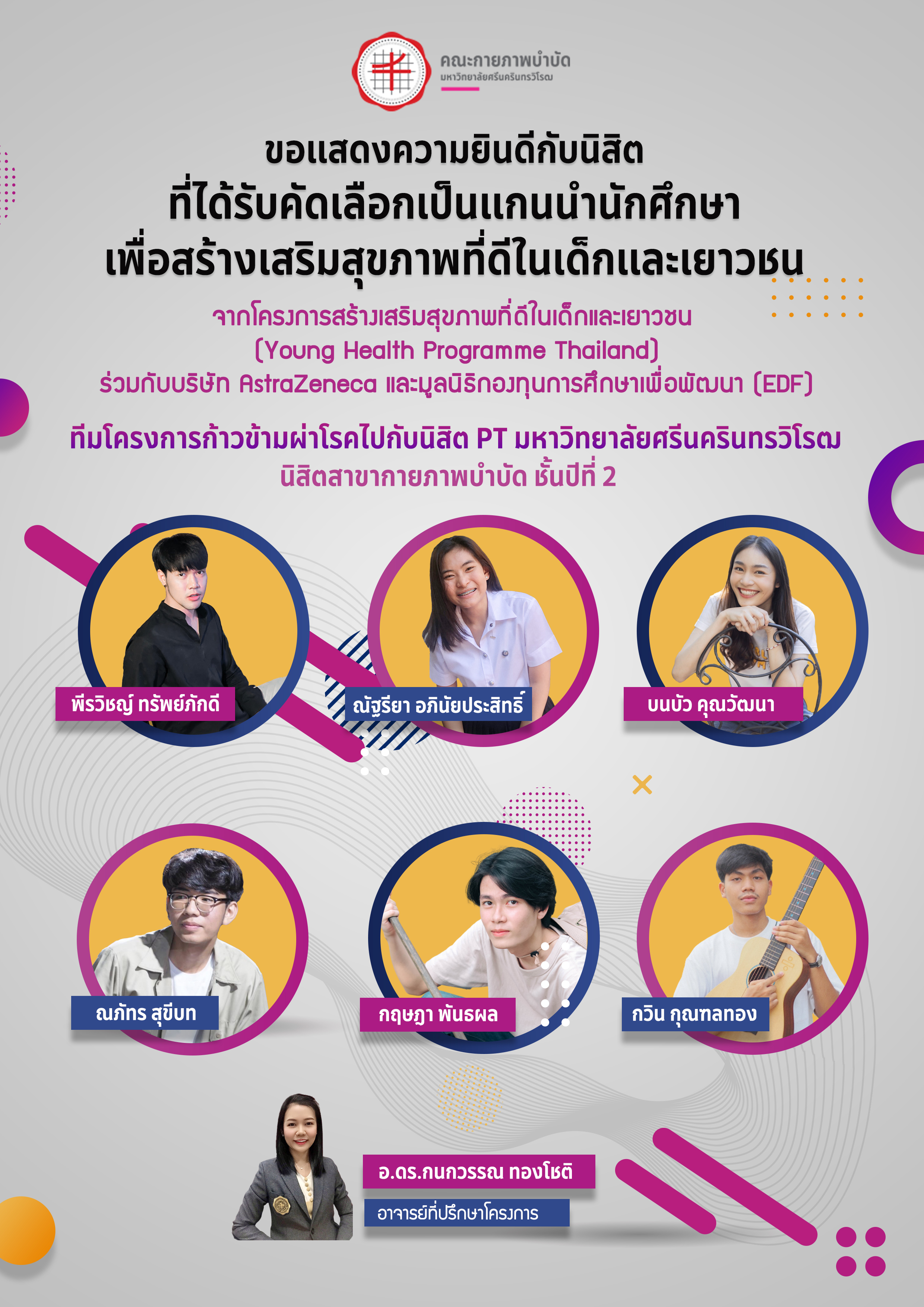 คณะกายภาพบำบัด มศว ขอแสดงความยินดีกับนิสิตที่ได้รับคัดเลือกเป็นแกนนำนักศึกษาเพื่อสร้างเสริมสุขภาพที่ดีในเด็กและเยาวชน