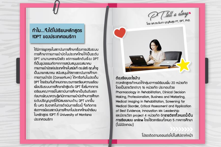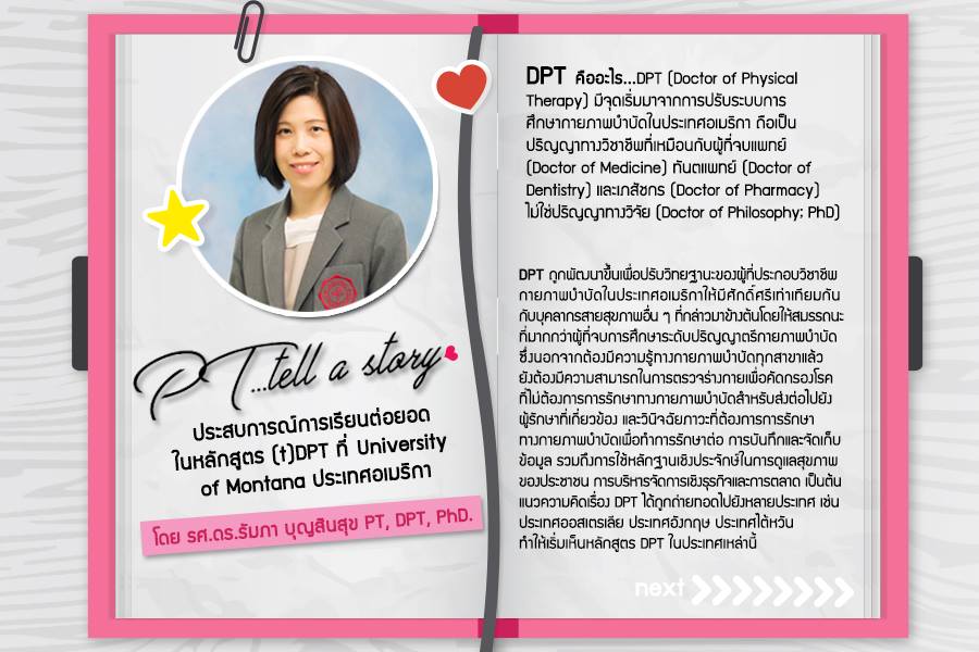 PT tell a story [PT tell a story] ประสบการณ์เรียนต่อยอดในหลักสูตร (t)DPT ที่ University of Montana ประเทศอเมริกา โดย รศ.ดร.รัมภา บุญสินสุข PT, DPT, PhD. PreviousNext