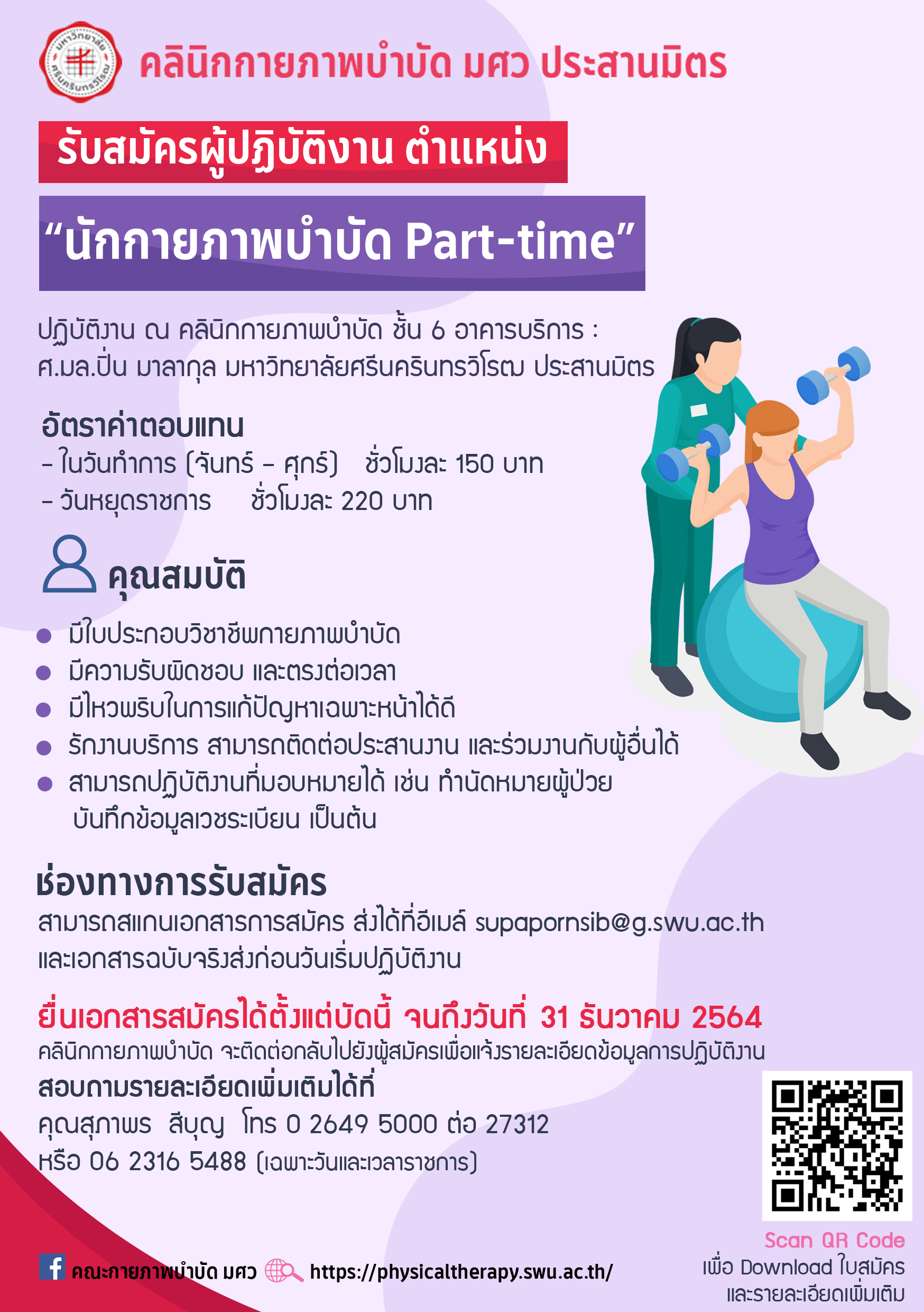 รับสมัครผู้ปฏิบัติงาน ตำแหน่งนักกายภาพบำบัด part-time