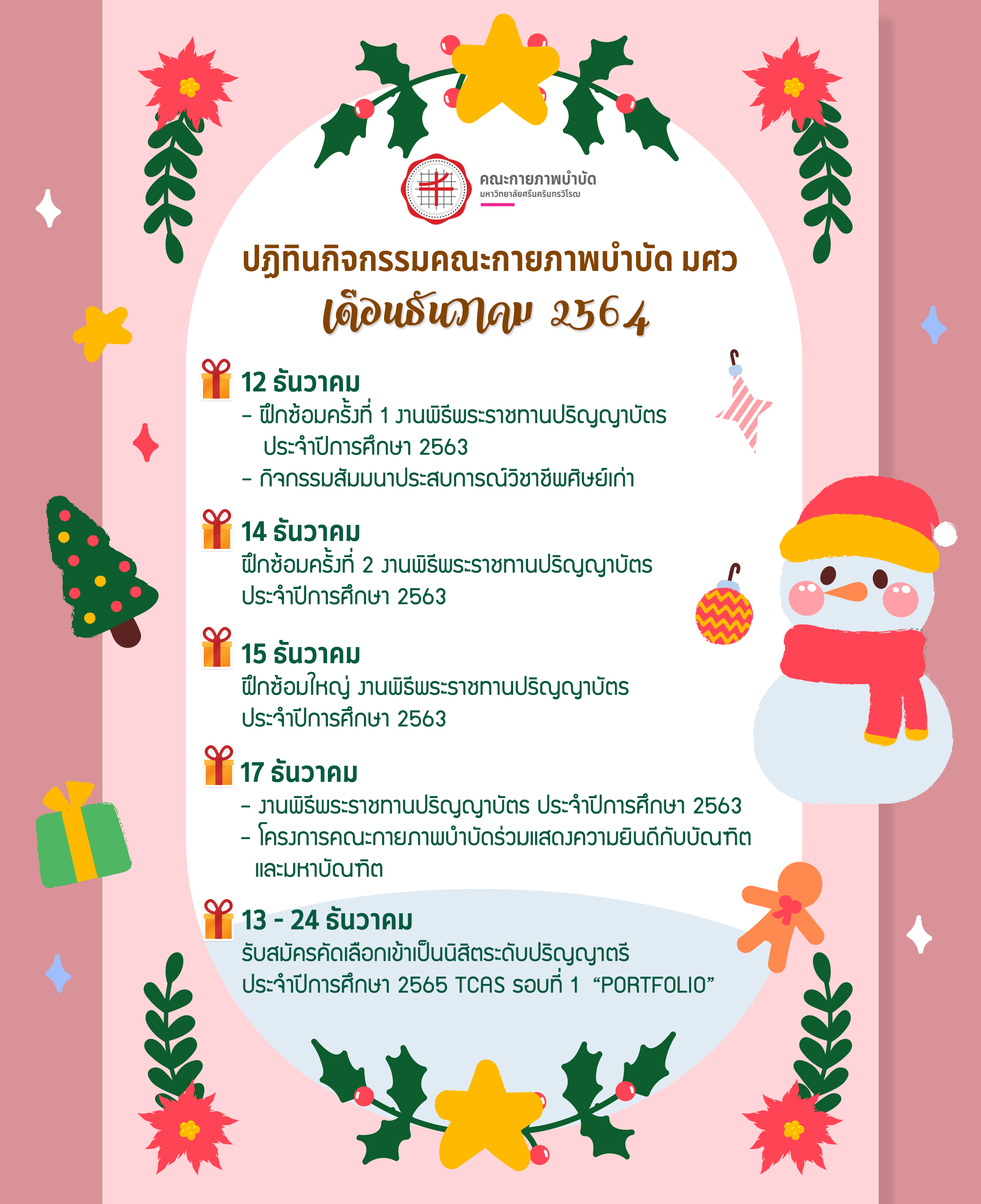ข่าวประชาสัมพันธ์ ปฏิทินกิจกรรม/โครงการ คณะกายภาพบำบัด มศว เดือนธันวาคม 2564 วันเริ่ม 2021-12-01 External URL link https://www.facebook.com/ptswu