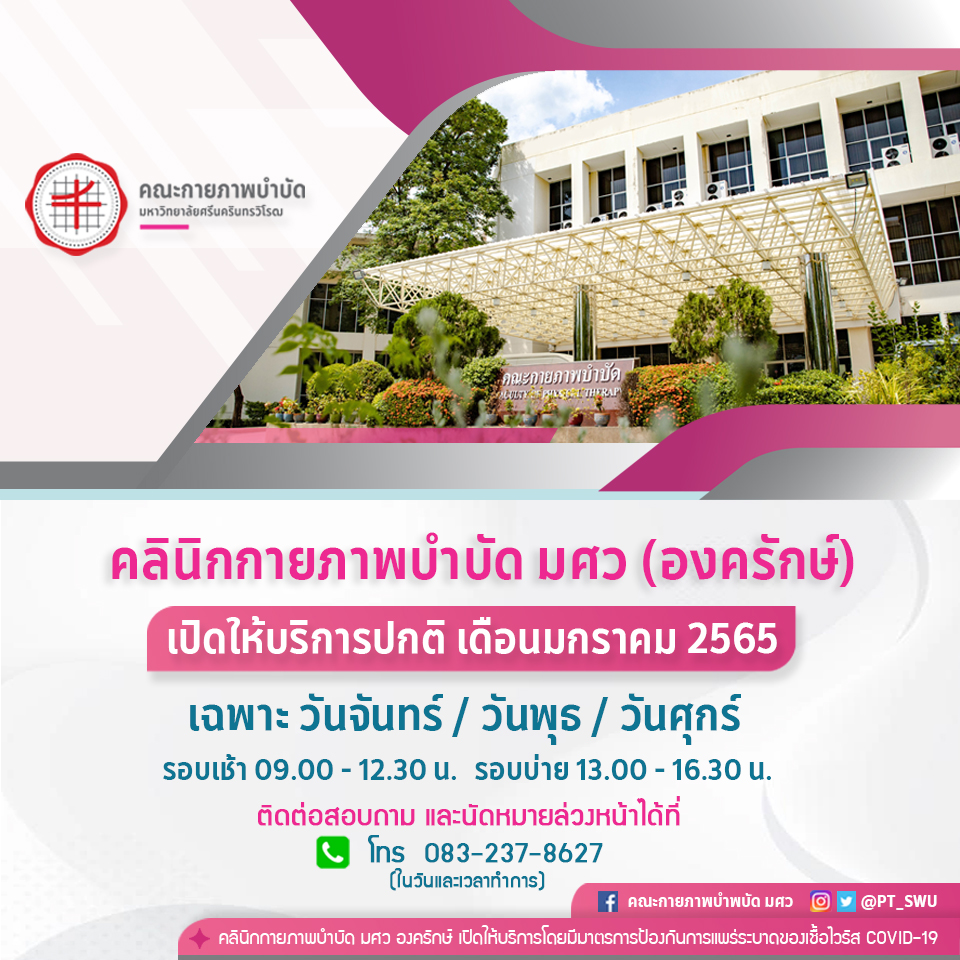 หมายเหตุ : คลินิกกายภาพบำบัด มศว องครักษ์ เปิดให้บริการโดยมีมาตรการป้องกันการแพร่ระบาดของเชื้อไวรัส COVID-19