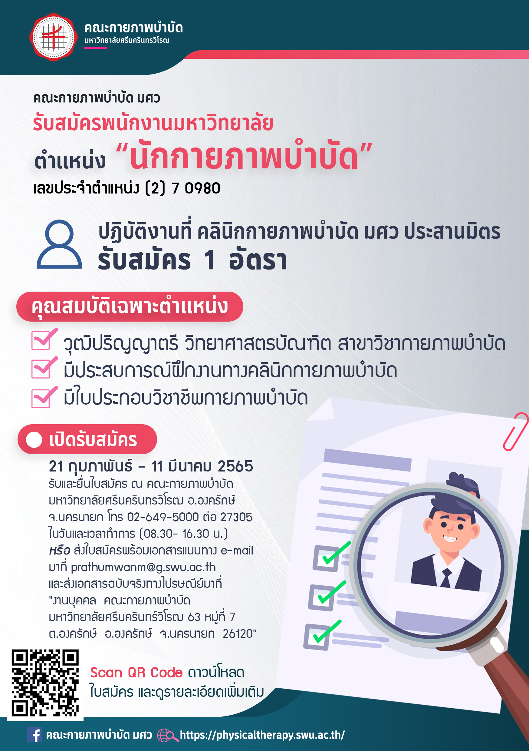 คณะกายภาพบำบัด มศว รับสมัครพนักงานมหาวิทยาลัย ตำแหน่ง “นักกายภาพบำบัด"