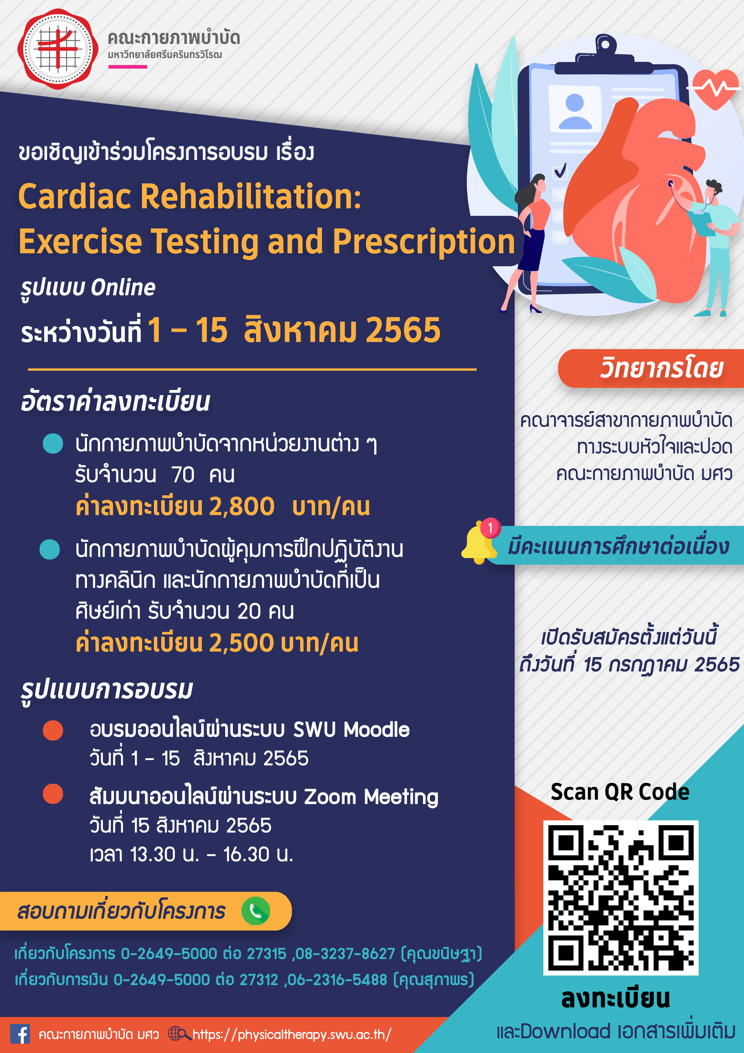คณะกายภาพบำบัด มศว ขอเชิญนักกายภาพบำบัด อาจารย์ จากสถาบันต่างๆ เข้าร่วม โครงการอบรม เรื่อง Cardiac rehabilitation: Exercise testing and prescription