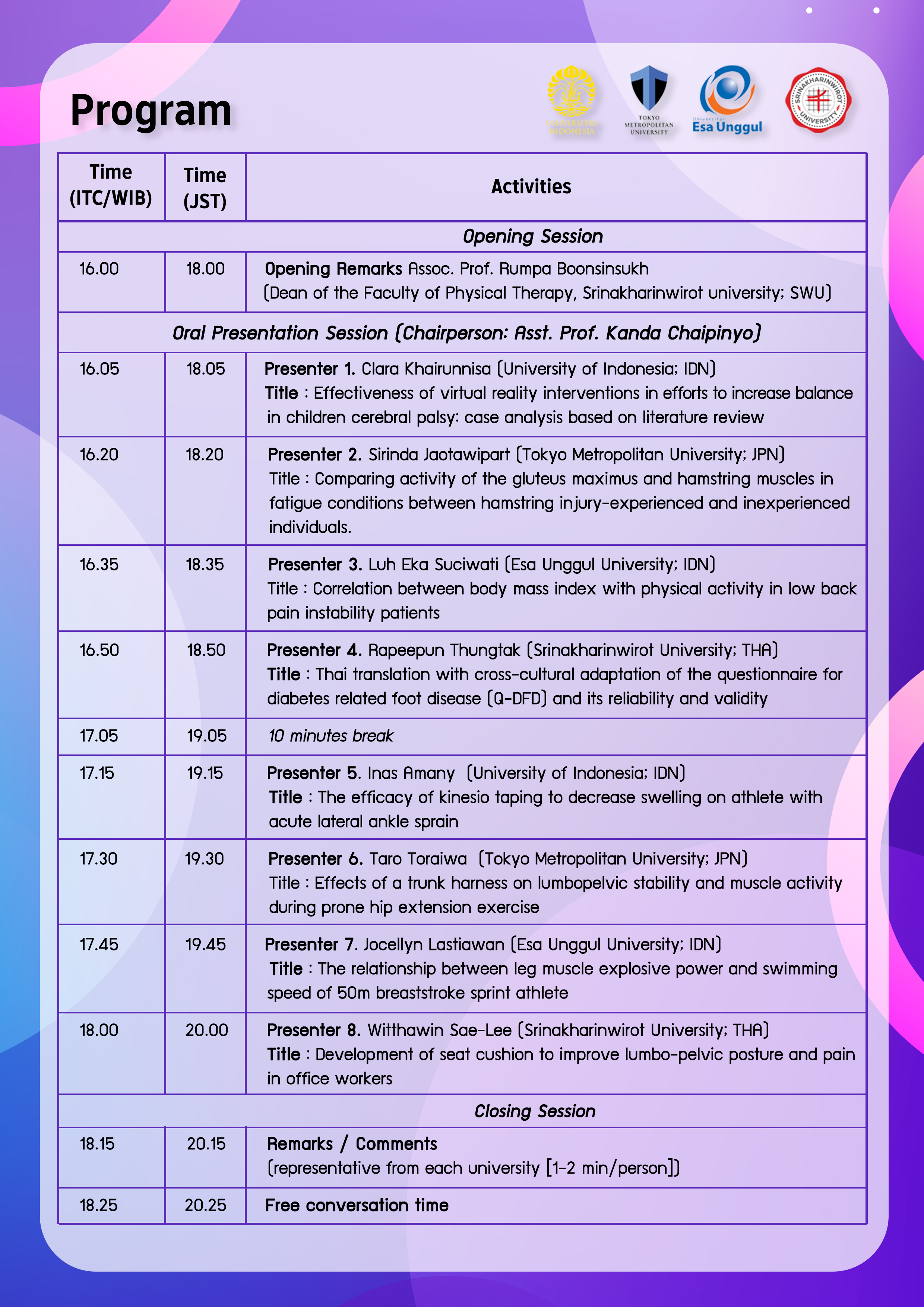 This conference was held at the first time since 2021 with 4 universities, inclued University of Indonesia, Tokyo Metropolitan University, Esa Unggul University and Srinakharinwirot University.