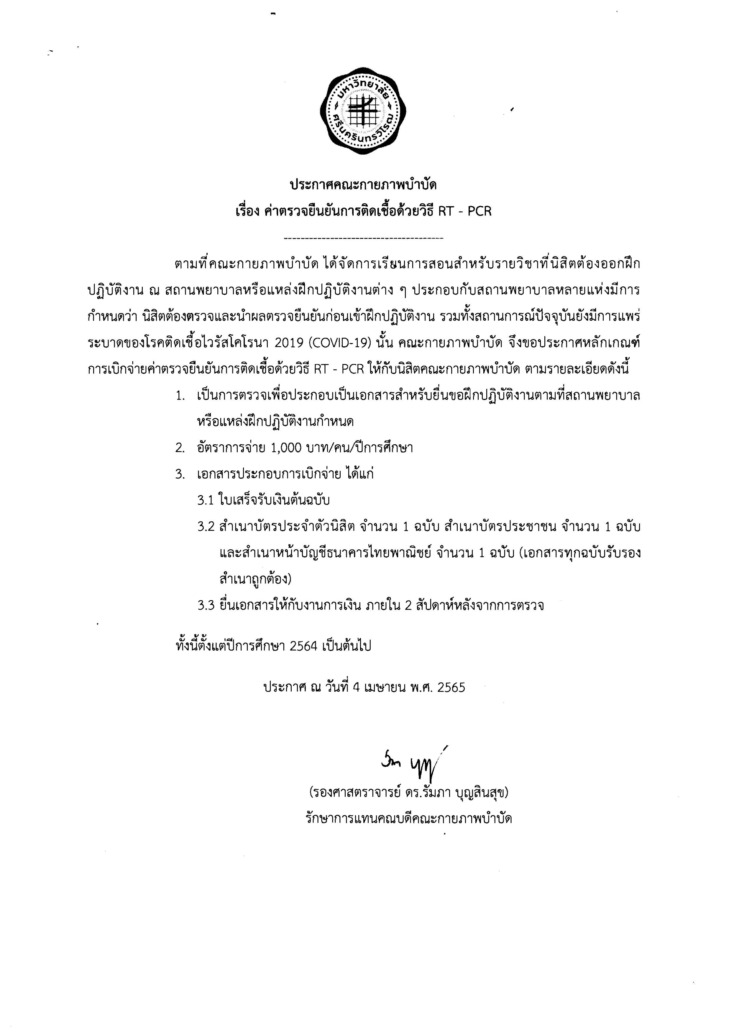 การเบิกจ่ายค่าตรวจยืนยันการติดเชื้อด้วยวิธี RT - PCR ให้กับนิสิตคณะกายภาพบำบัด