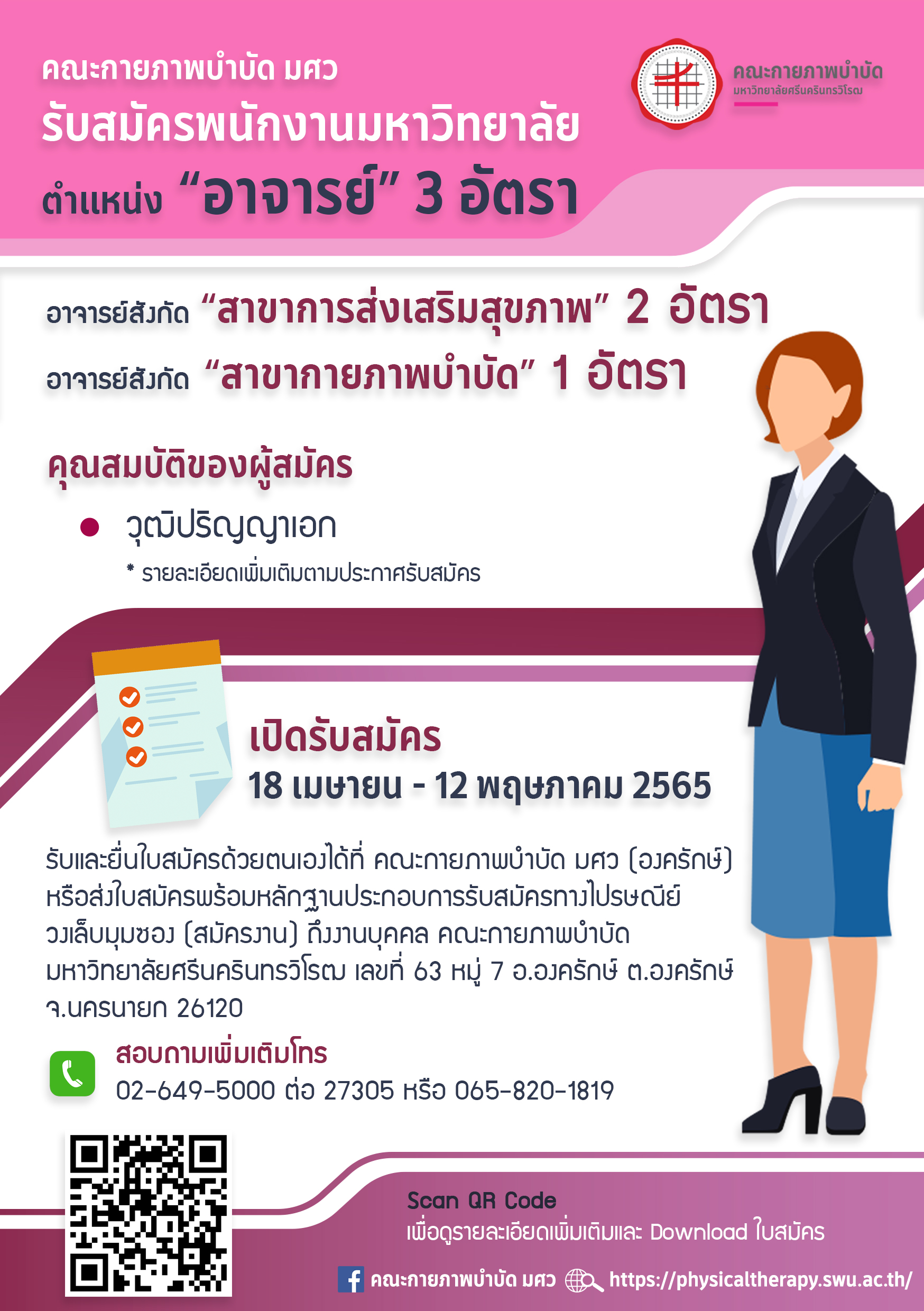 รับและยื่นใบสมัครด้วยตนเองได้ที่ คณะกายภาพบำบัด มศว (องครักษ์)