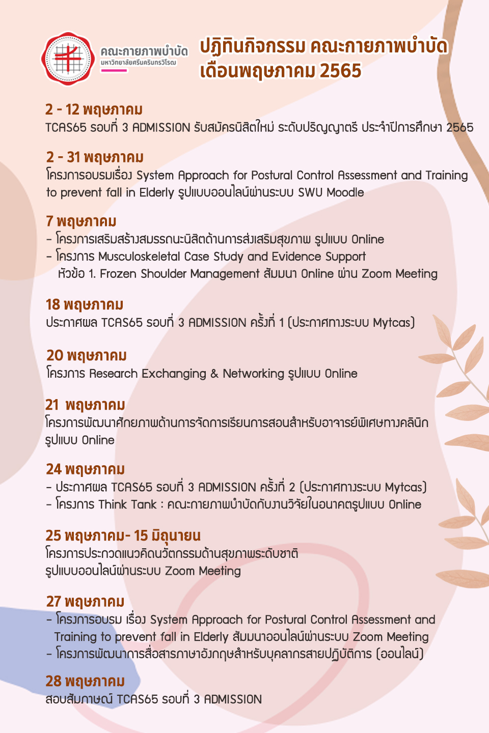 ปฏิทินกิจกรรม/โครงการ คณะกายภาพบำบัด มศว เดือนพฤษภาคม 2565