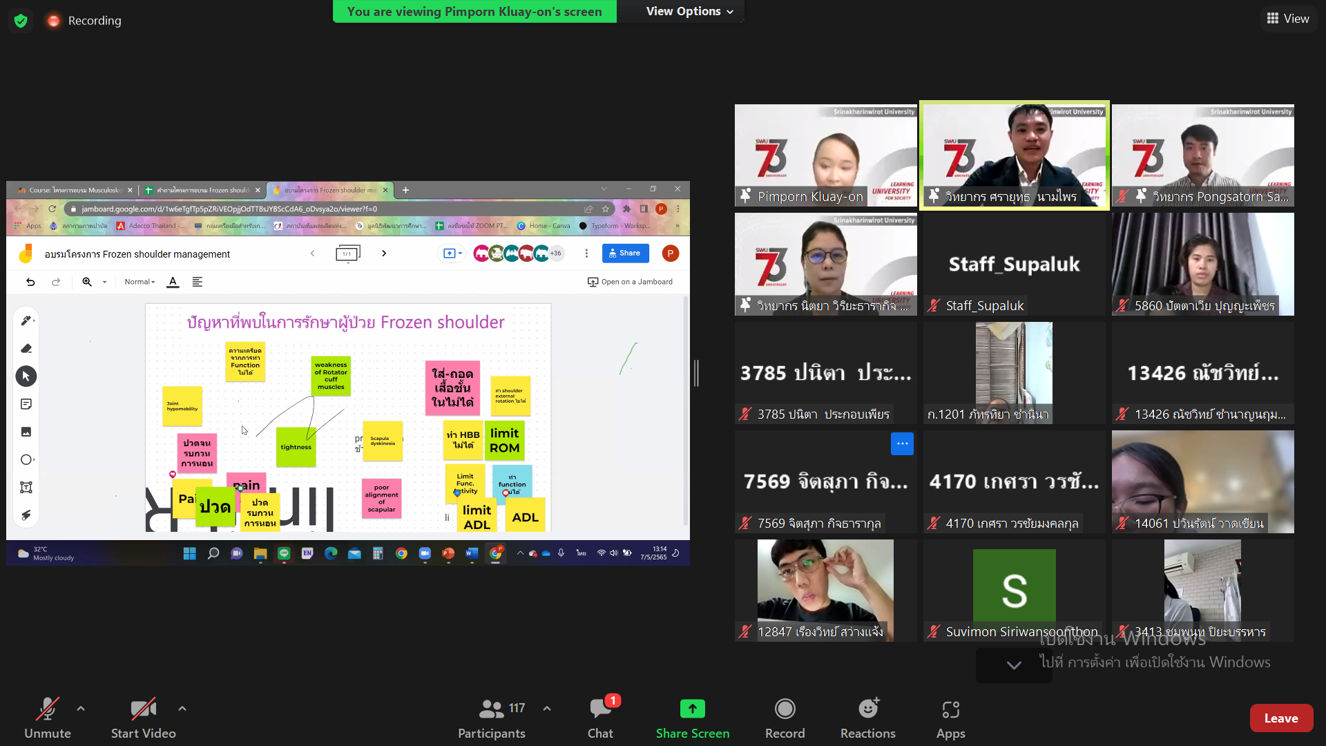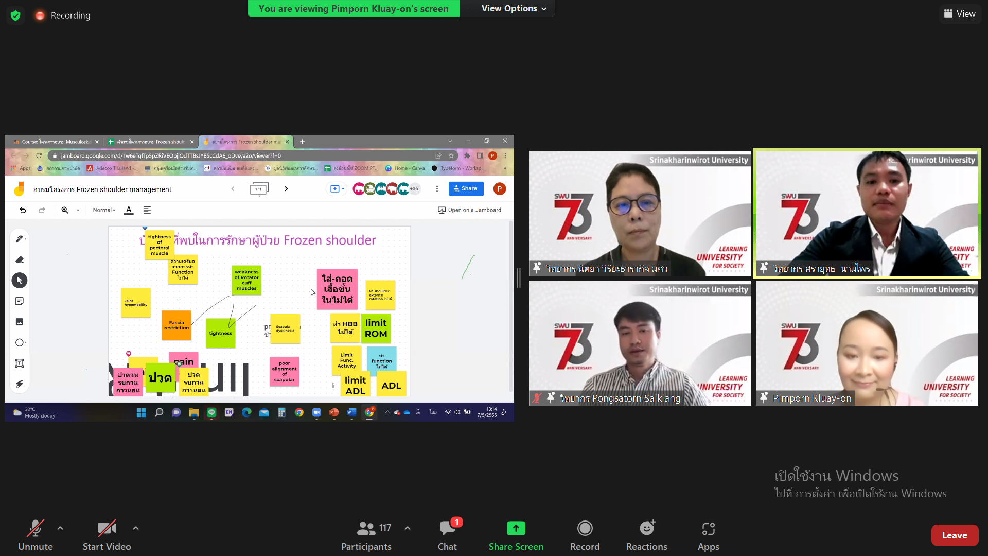 คณะกายภาพบำบัด มศว จัดโครงการอบรม Musculoskeletal case study and evidence support หัวข้อที่ 1 “Frozen Shoulder Management” ให้กับนักกายภาพบำบัด และอาจารย์จากสถาบันต่าง ๆ โดยมีการอบรมออนไลน์ผ่านระบบ SWU Moodle ระหว่างวันที่ 25 เมษายน 2565 - 7 พฤษภาคม 2565 และจัดกิจกรรมสัมมนารูปแบบออนไลน์ผ่านระบบ Zoom meeting เมื่อวันที่ 7 พฤษภาคม 2565 เวลา 13.00-15.00 น. วิทยากรโดย