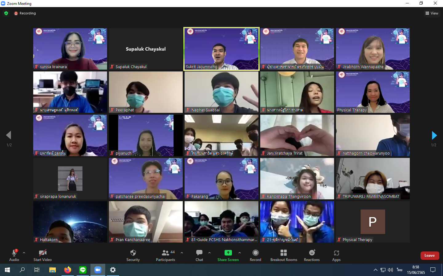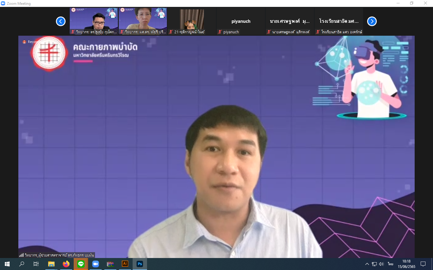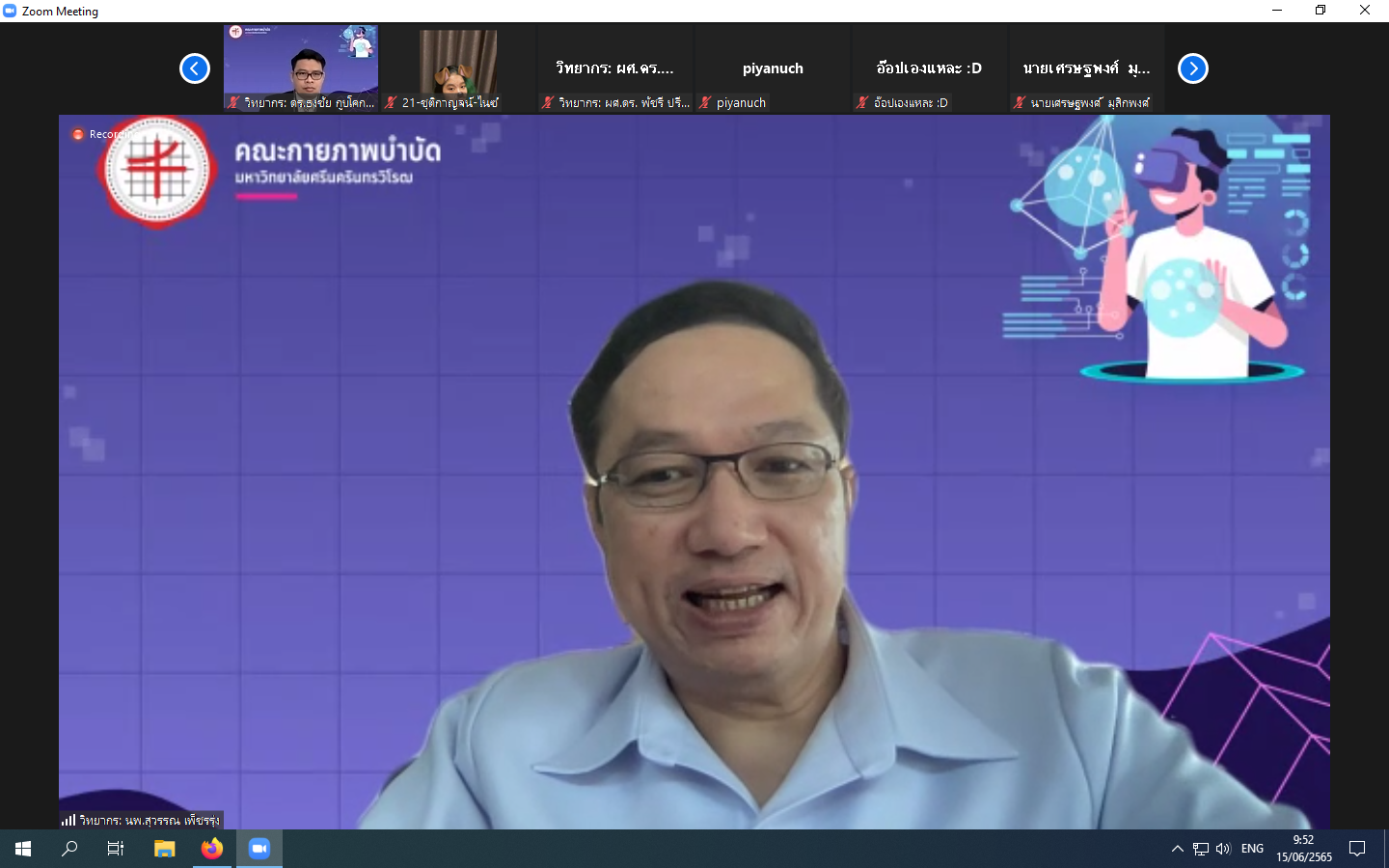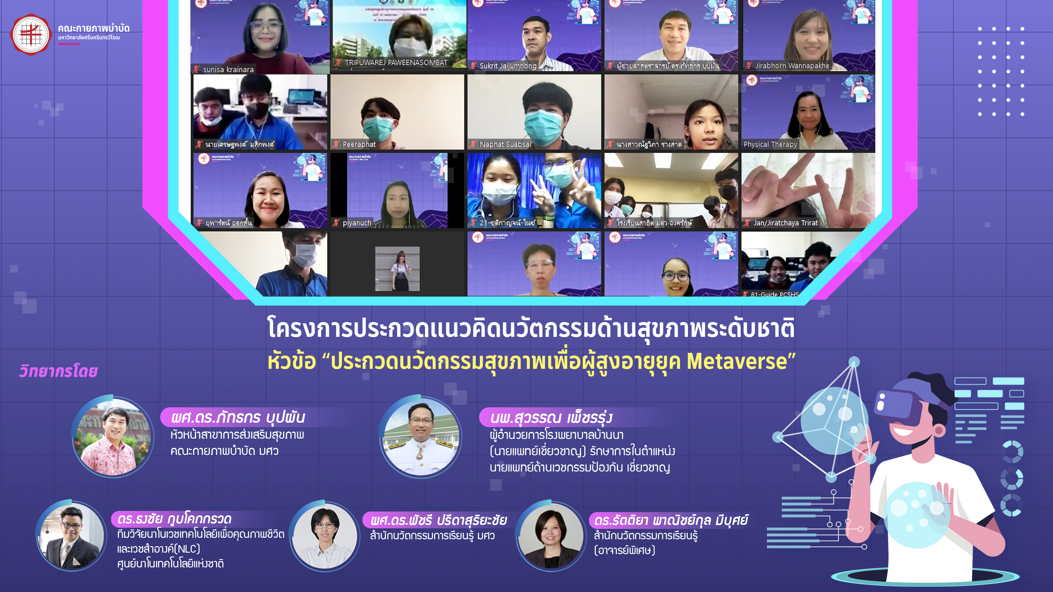 สาขาการส่งเสริมสุขภาพ คณะกายภาพบำบัด มศว จัดโครงการประกวดแนวคิดนวัตกรรมด้านสุขภาพระดับชาติ ในหัวข้อ “ประกวดนวัตกรรมสุขภาพเพื่อผู้สูงอายุยุค Metaverse” เมื่อวันที่ 15 มิถุนายน 2565 รูปแบบออนไลน์ผ่าน Zoom Meeting ให้กับนักเรียน และนิสิต/นักศึกษา ที่สนใจเข้าร่วมโครงการจากทั่วประเทศ โดยได้รับเกียรติจากวิทยากรผู้เชี่ยวชาญทั้ง 5 ท่านได้แก่