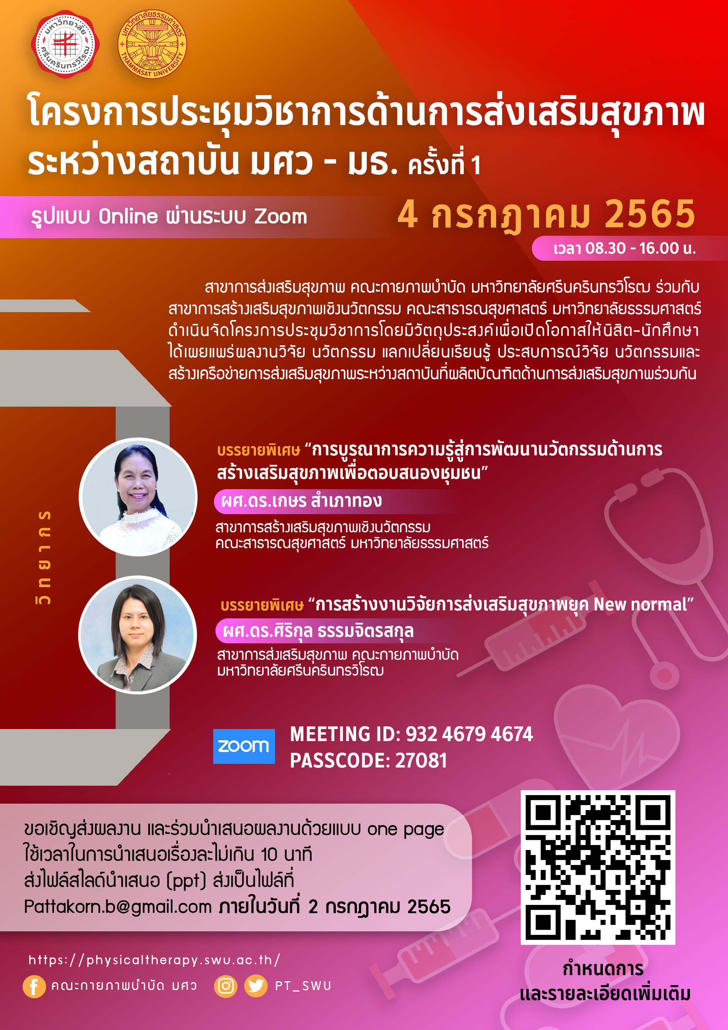 ขอเชิญนิสิต/นักศึกษา เข้าร่วมโครงการประชุมวิชาการด้านการส่งเสริมสุขภาพ ระหว่างสถาบัน มศว - มธ. ครั้งที่ 1 โดยสาขาการส่งเสริมสุขภาพ คณะกายภาพบำบัด มหาวิทยาลัยศรีนครินทรวิโรฒ ร่วมกับสาขาการสร้างเสริมสุขภาพเชิงนวัตกรรม คณะสาธารณสุขศาสตร์ มหาวิทยาลัยธรรมศาสตร์ดำเนินจัดโครงการประชุมวิชาการโดยมีวัตถุประสงค์เพื่อเปิดโอกาสให้นิสิต-นักศึกษาได้เผยแพร่ผลงานวิจัย นวัตกรรม แลกเปลี่ยนเรียนรู้ ประสบการณ์วิจัย นวัตกรรมและสร้างเครือข่ายการส่งเสริมสุขภาพระหว่างสถาบันที่ผลิตบัณฑิตด้านการส่งเสริมสุขภาพร่วมกัน