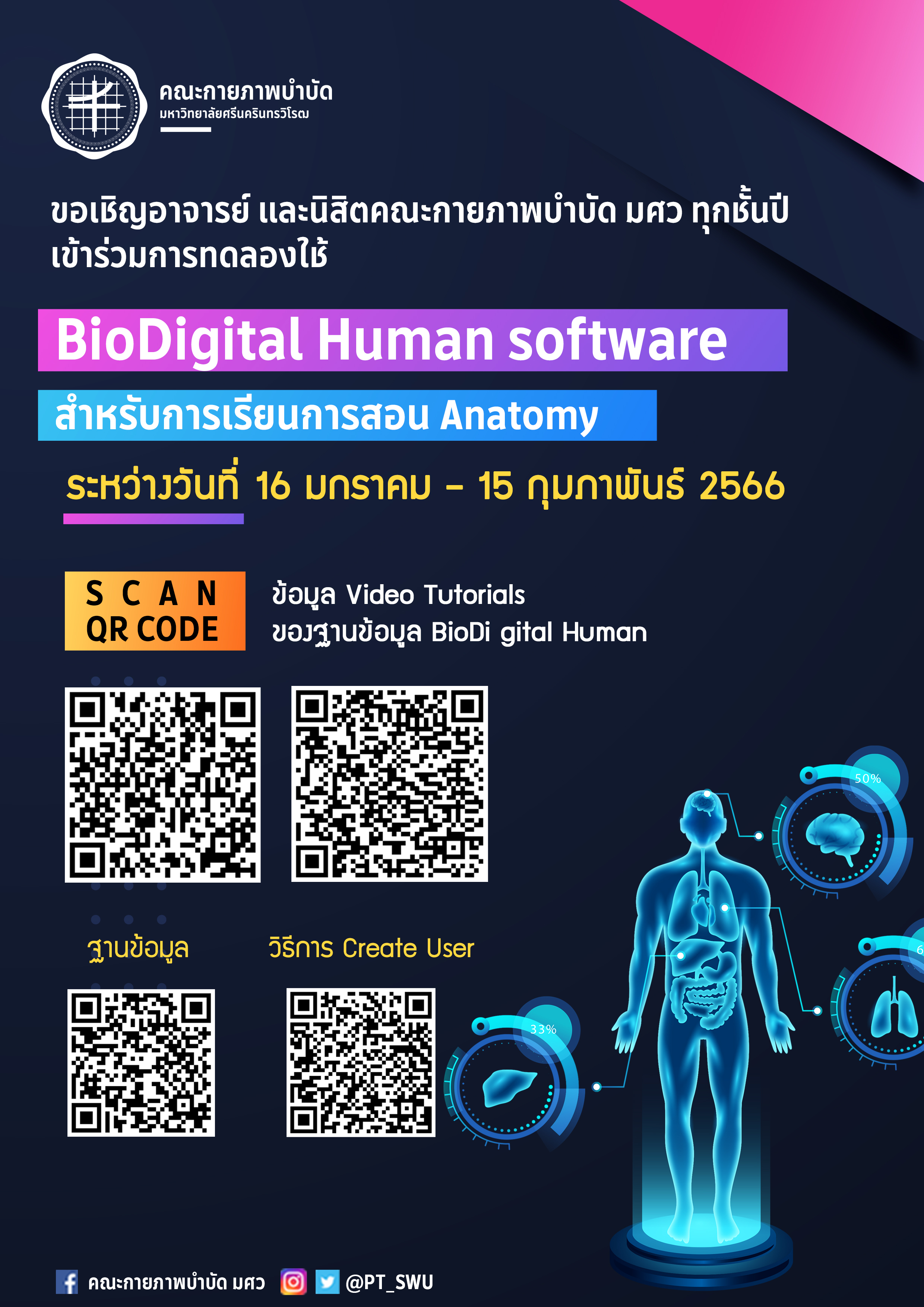 คณะกายภาพบำบัดมีนโยบายส่งเสริมการเรียนการสอนกายวิภาคศาสตร์ โดยการใช้ Anatomy software เพื่อประโยชน์ในการเรียนการสอนของอาจารย์และนิสิต บัดนี้ฐานข้อมูล BioDigital Human on Ovid ได้ดำเนินการเปิดทดลองใช้งานฐานข้อมูล ระหว่างวันที่ 16 มกราคม 2566 – 15 กุมภาพันธ์ 2566 ดังมีรายละเอียดตามไฟล์แนบ