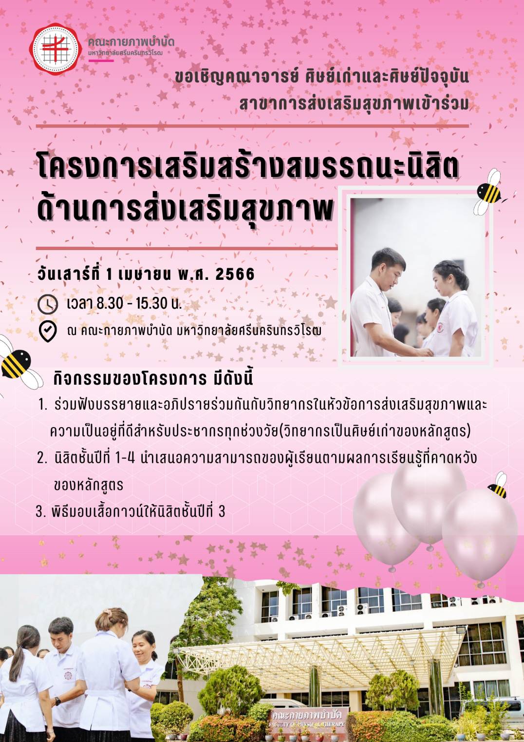ขอเชิญคณาจารย์ ศิษย์เก่า และศิษย์ปัจจุบัน สาขาวิชาการส่งเสริมสุขภาพ คณะกายภาพบำบัด มศว ทุกท่านเข้าร่วมโครงการเสริมสร้างสมรรถนะนิสิตด้านการส่งเสริมสุขภาพ ในวันเสาร์ที่ 1 เมษายน 2566 ณ คณะกายภาพบำบัด มศว เวลา 08.30 -15.30 น.