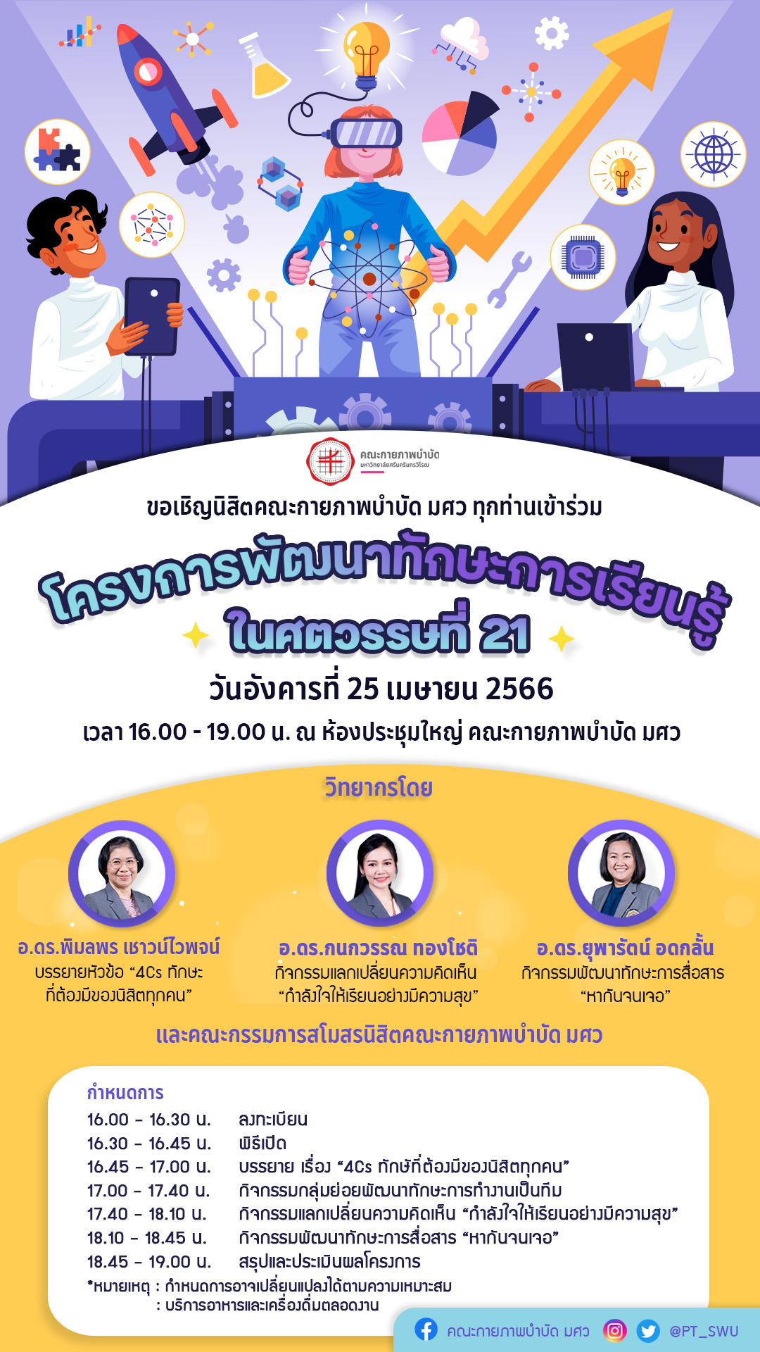 ข่าวประชาสัมพันธ์ ขอเชิญนิสิตคณะกายภาพบำบัด มศว ทุกท่านเข้าร่วมโครงการพัฒนาทักษะการเรียนรู้ในศตวรรษที่ 21ในวันอังคารที่ 25 เมษายน 2566 ณ ห้องประชุมใหญ่คณะกายภาพบำบัด มศว เวลา 16.00 - 19.00 น. วันเริ่ม 2023-04-20