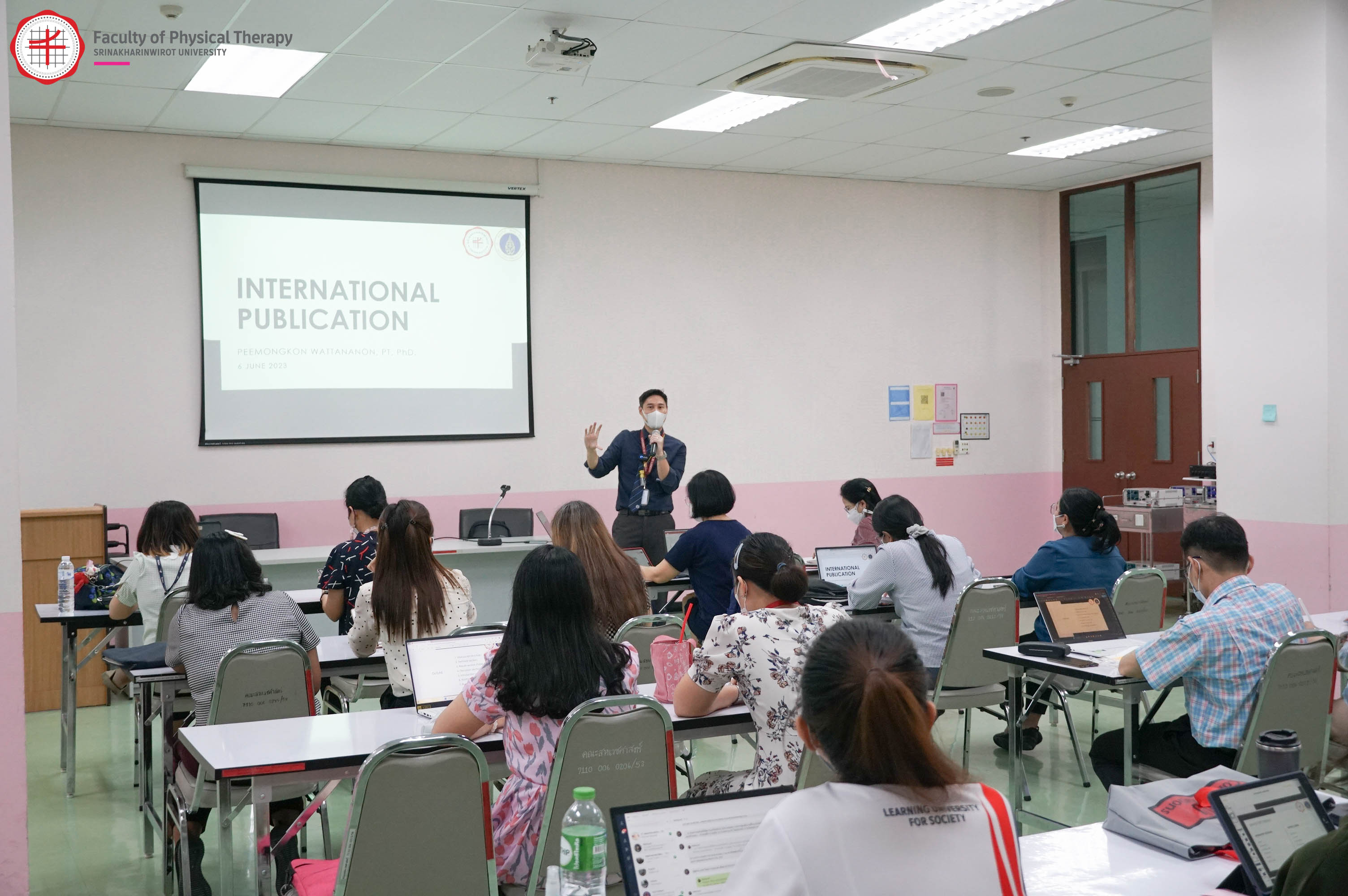 คณะกายภาพบำบัด มศว จัดโครงการพัฒนาศักยภาพการตีพิมพ์ ผลงานวิจัยในระดับนานาชาติ วิทยากรโดย รศ.ดร.กภ.พีร์มงคล วัฒนานนท์ คณะกายภาพบำบัด มหาวิทยาลัยมหิดล อบรมเชิงปฏิบัติการหัวข้อ "ประสบการณ์การตีพิมพ์ผลงานวิจัยในระดับนานาชาติ" เมื่อวันที่ 6 มิถุนายน 2566 ณ คณะกายภาพบำบัด มศว