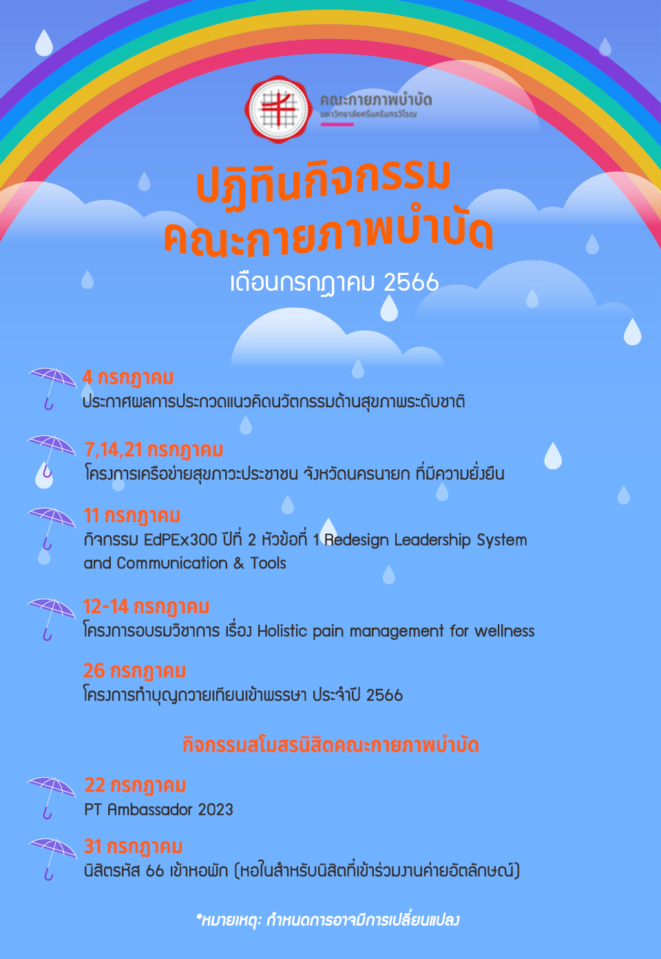 ข่าวประชาสัมพันธ์ ปฏิทินกิจกรรม/โครงการ คณะกายภาพบำบัด มศว ประจำเดือนกรกฎาคม 2566 วันเริ่ม 2023-07-03
