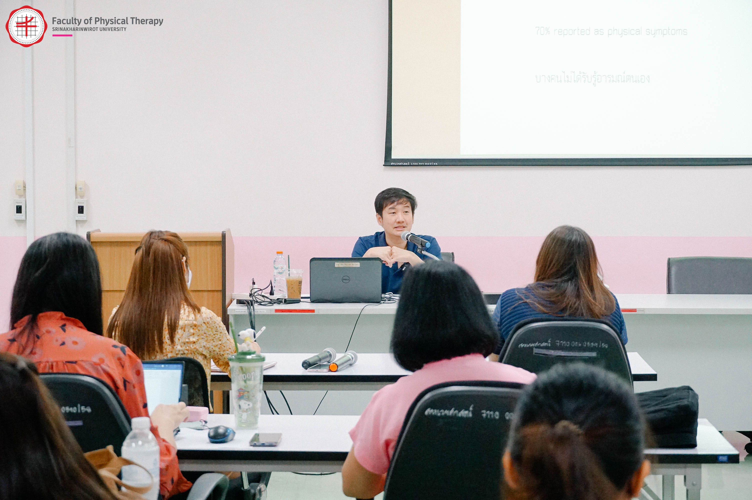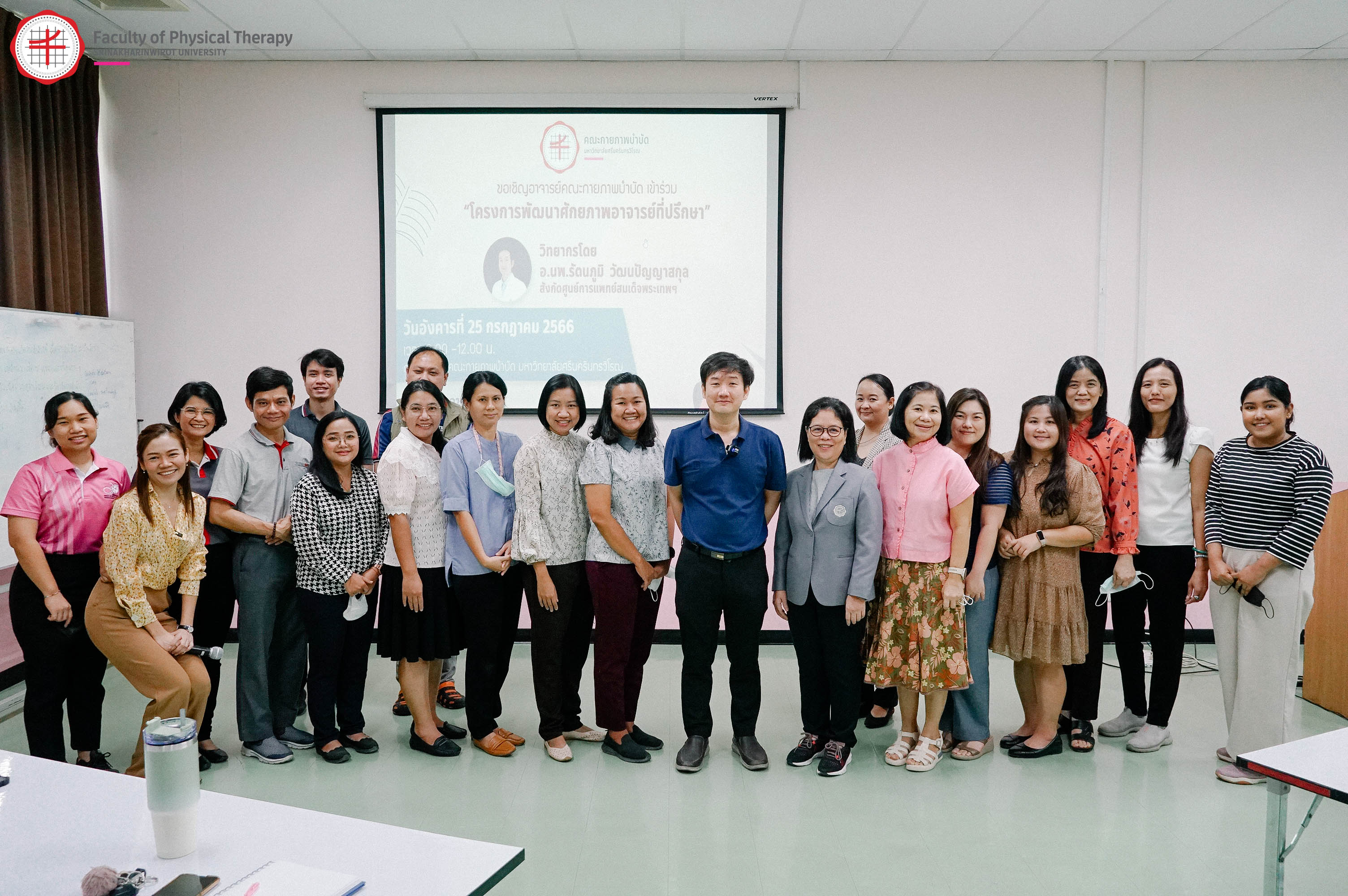 คณะกายภาพบำบัด มศว จัดโครงการพัฒนาศักยภาพอาจารย์ที่ปรึกษา เมื่อวันที่ 25 กรฎาคม 2566 เพื่อให้อาจารย์มีความรู้ความเข้าใจในการเลือกใช้วิธีการประเมินสุขภาพจิตที่เหมาะสมสำหรับวัยเรียนวัยรุ่น และหลักการในการบริหารจัดการภาวะสุขภาพจิตในระดับต่าง ๆ โดยมี อ.นพ.รัตนภูมิ วัฒนปัญญาสกุล เป็นวิทยากรในการบรรยายในครั้งนี้