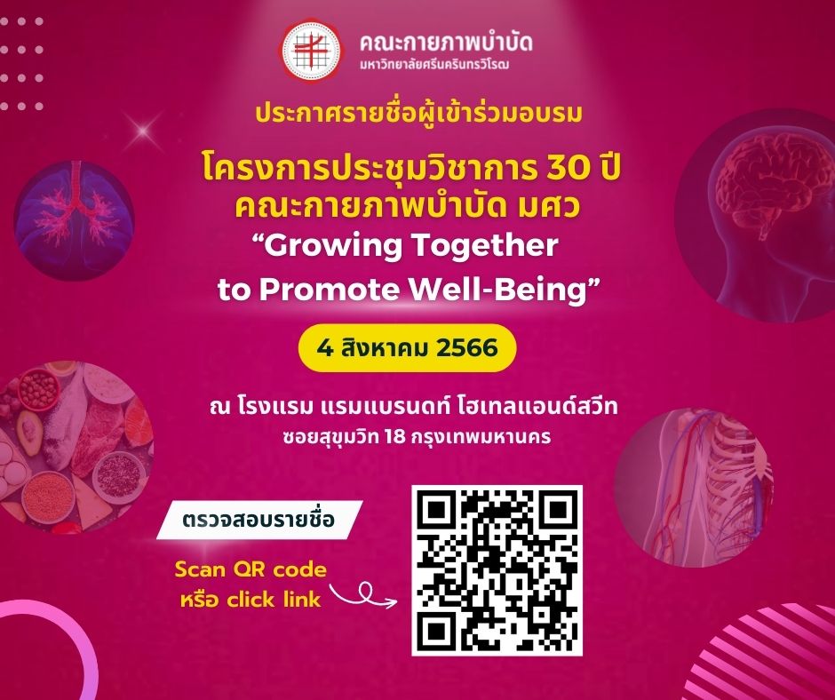 ข่าวประชาสัมพันธ์ ประกาศรายชื่อผู้เข้าร่วมโครงการประชุมวิชาการ 30 ปี คณะกายภาพบำบัด มศว “Growing Together to Promote Well-Being” ตรวจสอบรายชื่อได้ที่ไฟล์แนบด้านล่าง Attachment รายชื่อผู้เข้าร่วมโครงการอบรมวิชาการ 30 ปีคณะกายภาพบำบัด มศว.pdf202.26 KB