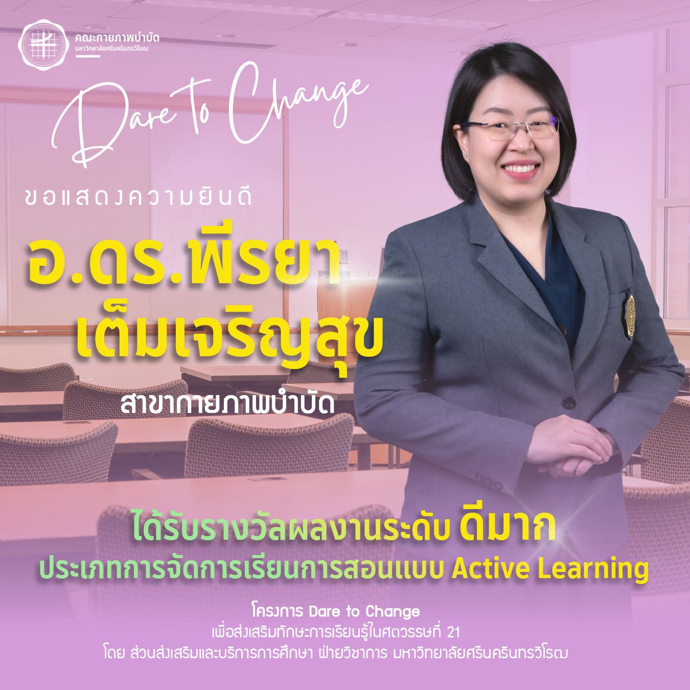 คณะกายภาพบำบัด มศว ขอแสดงความยินดีกับคณาจารย์ที่ได้รับรางวัลจากโครงการ Dare to Change เพื่อส่งเสริมทักษะการเรียนรู้ในศตวรรษที่ 21