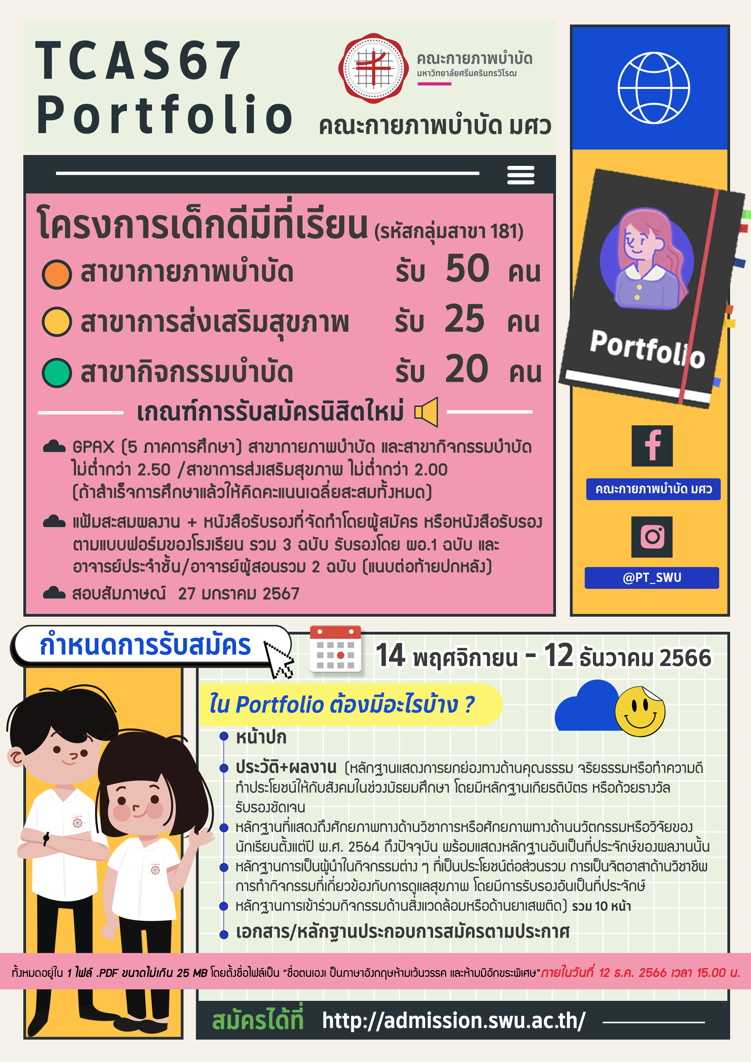 คณะกายภาพบำบัด มศว เปิดรับสมัครนิสิตใหม่ระดับปริญญาตรี ปีการศึกษา 2567 TCAS รอบที่ 1 Portfolio