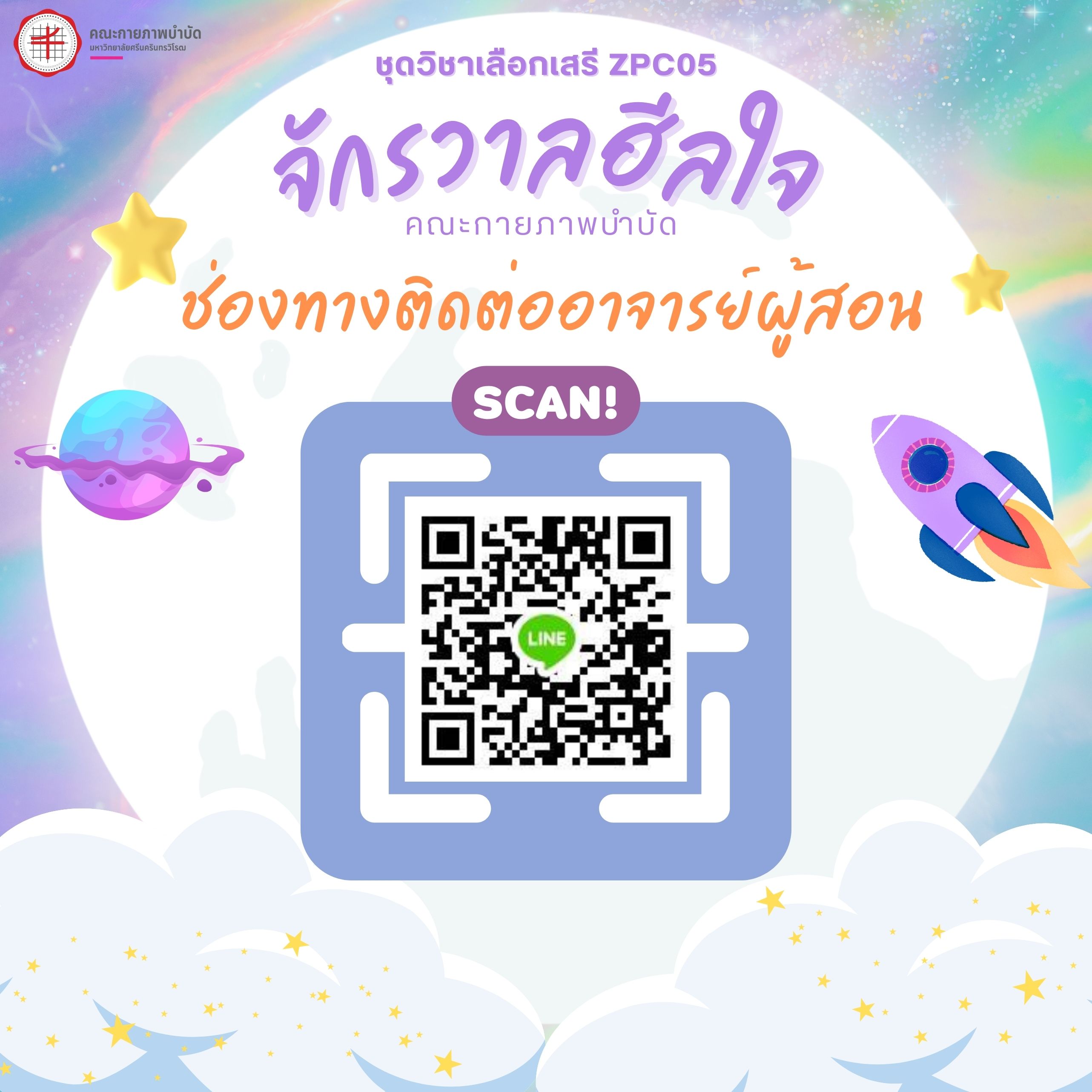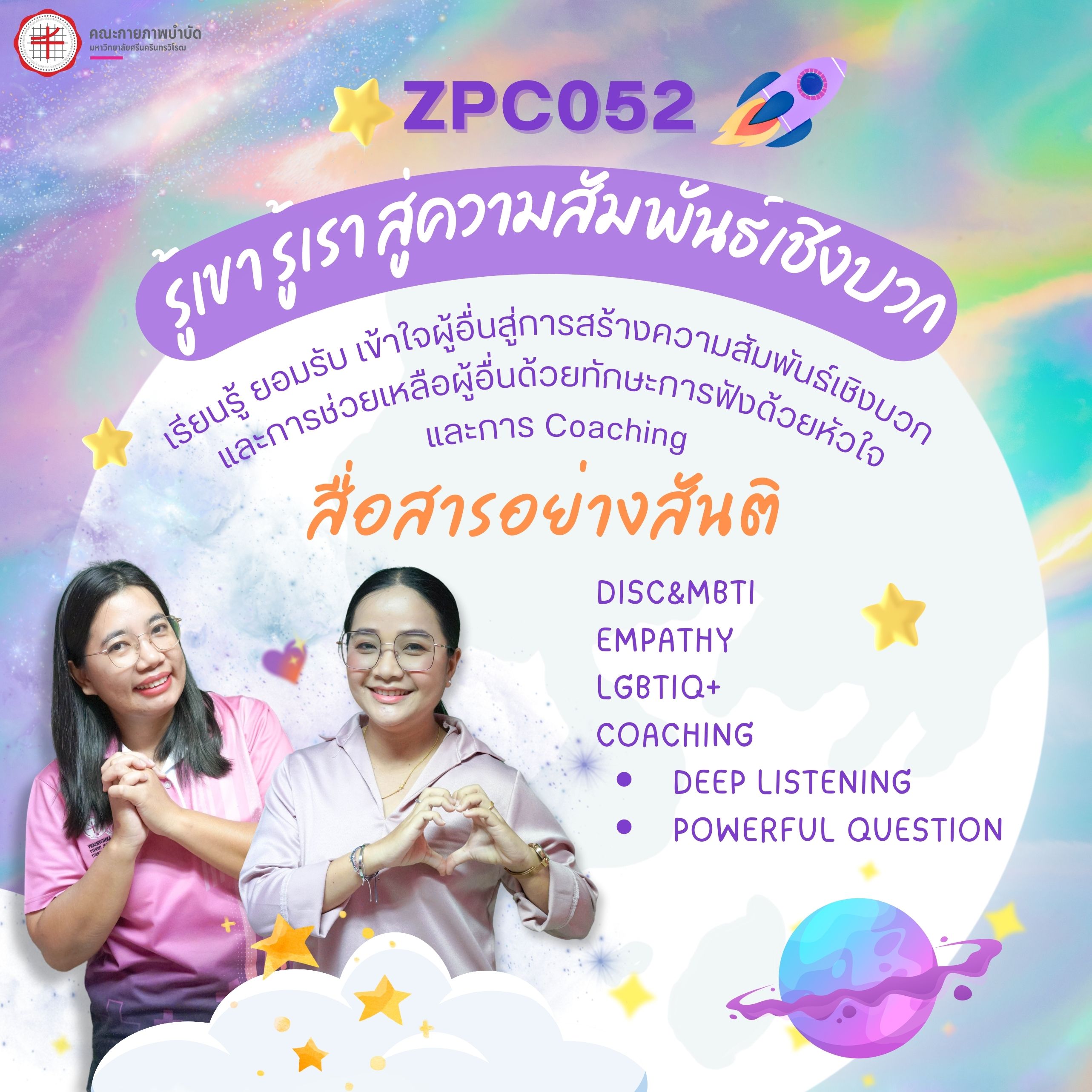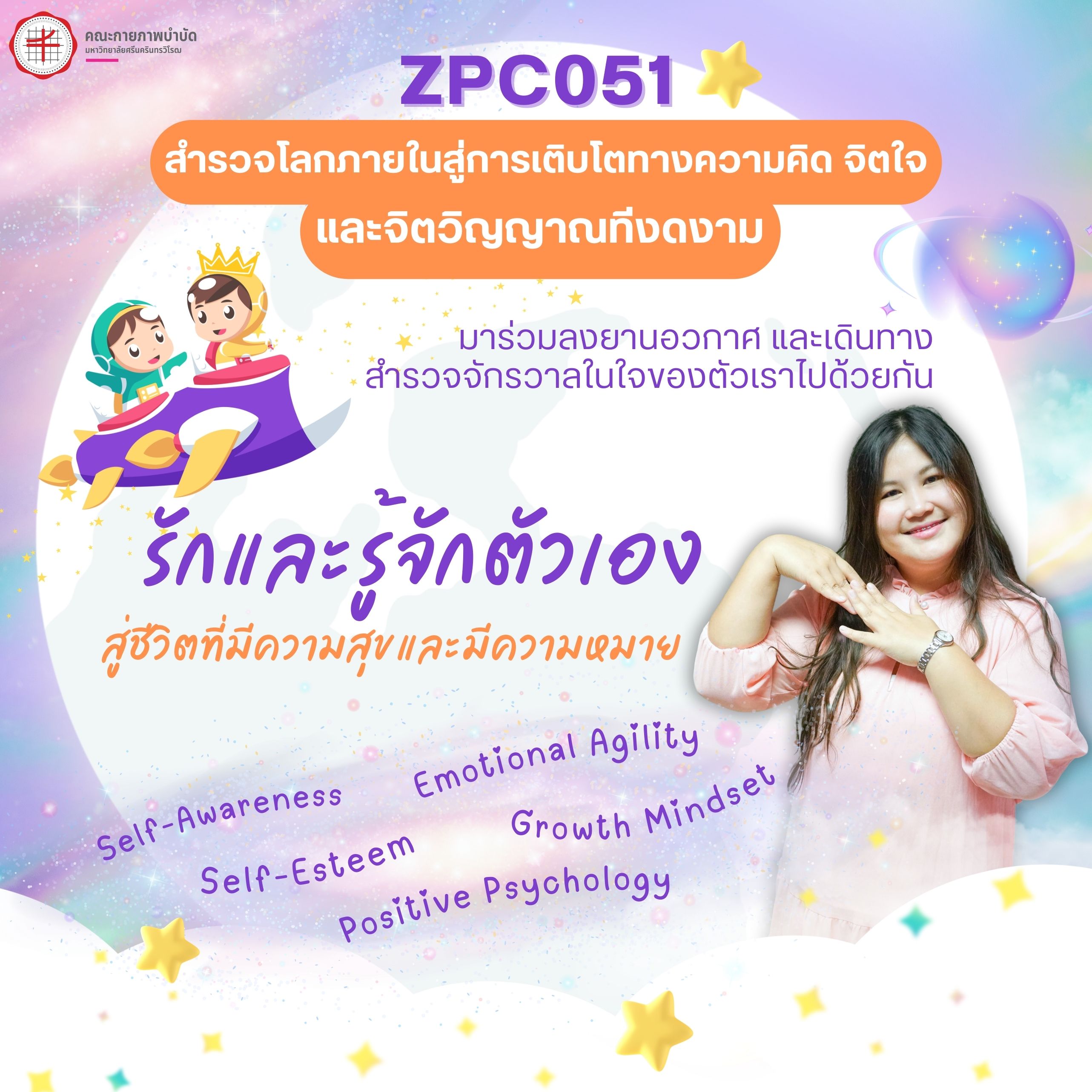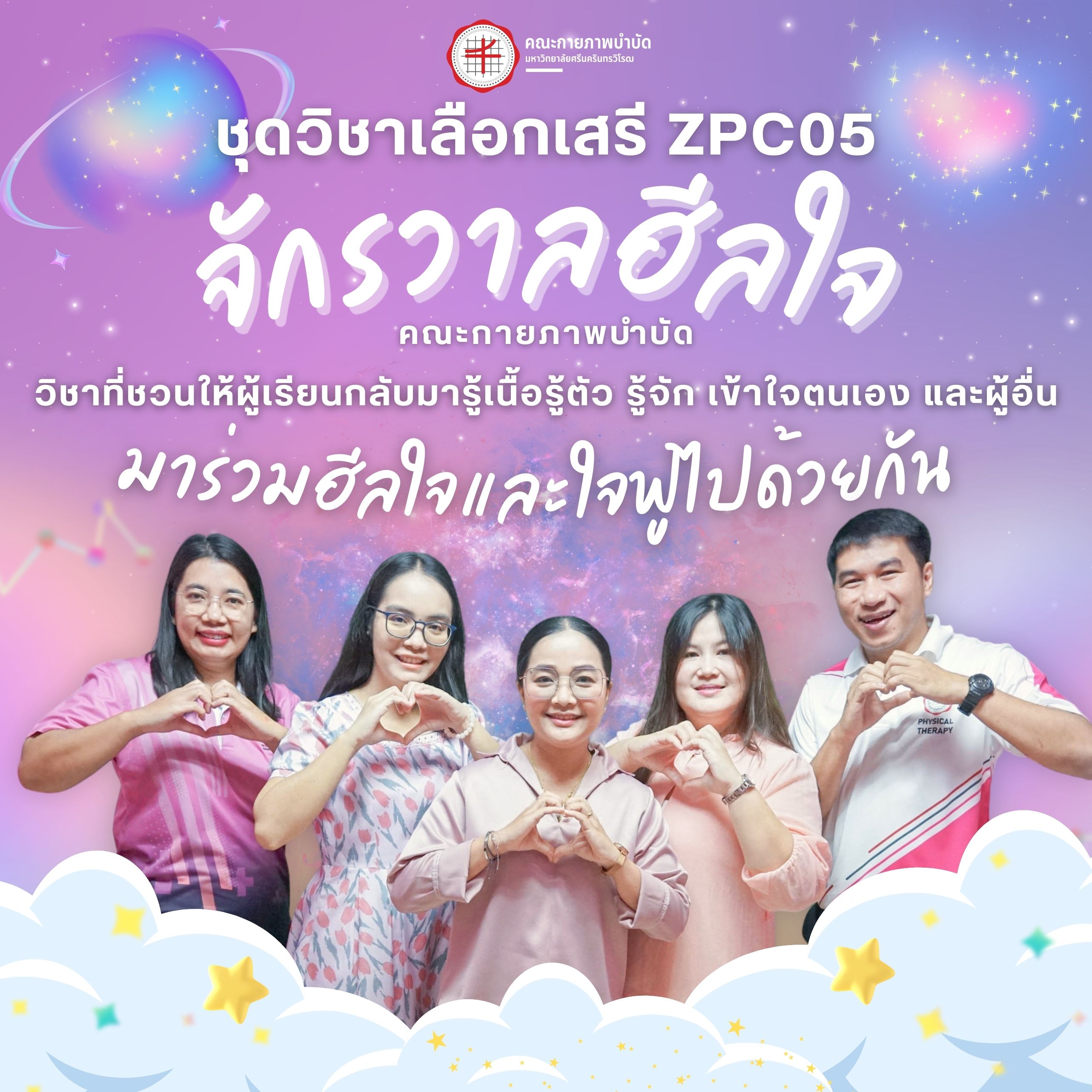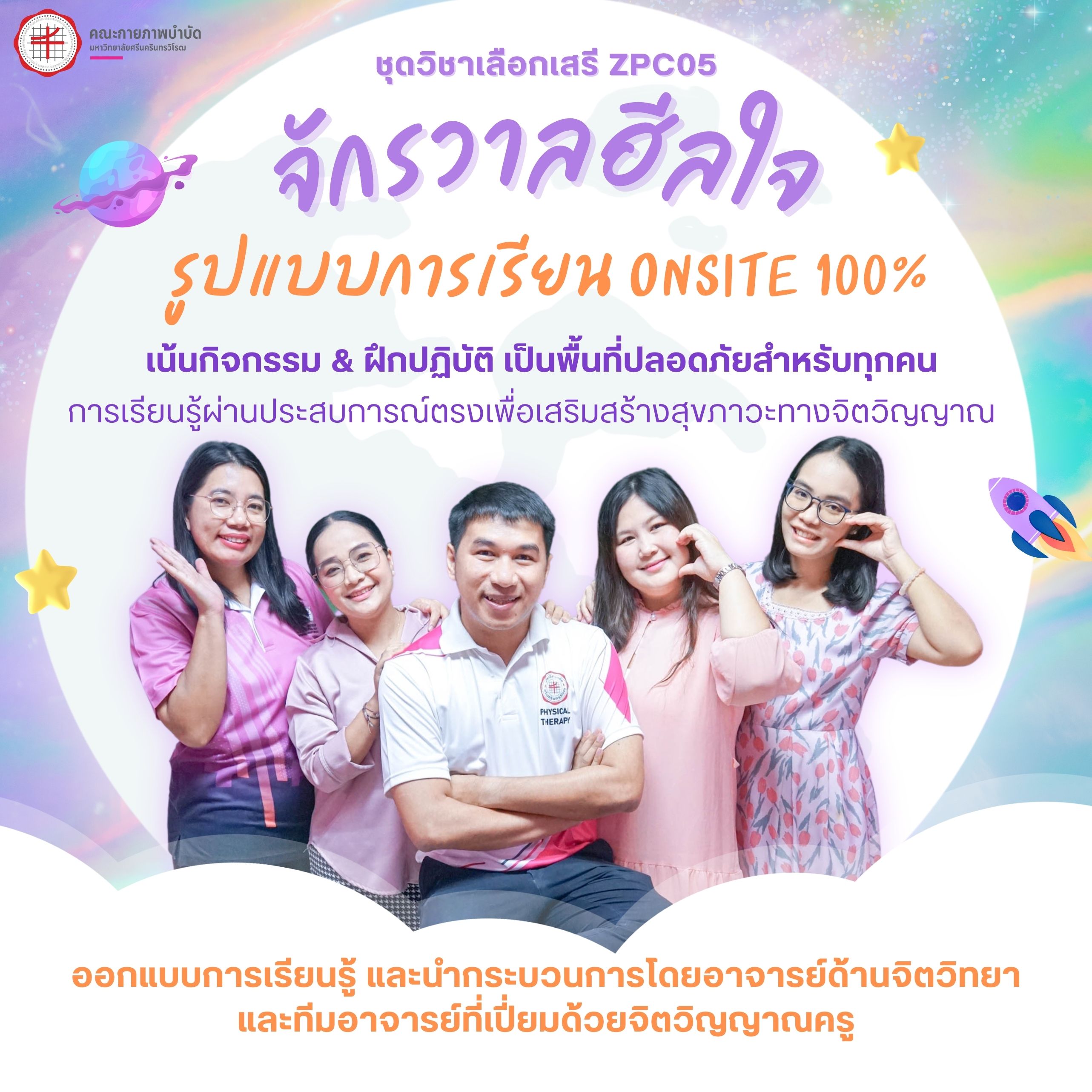 ข่าวประชาสัมพันธ์ คณะกายภาพบำบัด มีชุดวิชาเลือกเสรีมาใหม่จ้าาา ZPC 05 จักรวาลฮีลใจ ZPC 051 สำรวจโลกภายในสู่การเติบโตทางความคิด จิตใจ และจิตวิญญาณที่งดงาม ZPC 052 รู้เขา รู้เรา สู่ความสัมพันธ์เชิงบวก Onsite 100% เน้นกิจกรรมและฝึกปฏิบัติ รับเพียง 40 ที่นั่ง มาร่วมฮีลใจและใจฟูไปด้วยกัน วันเริ่ม 2023-11-28 PreviousNext