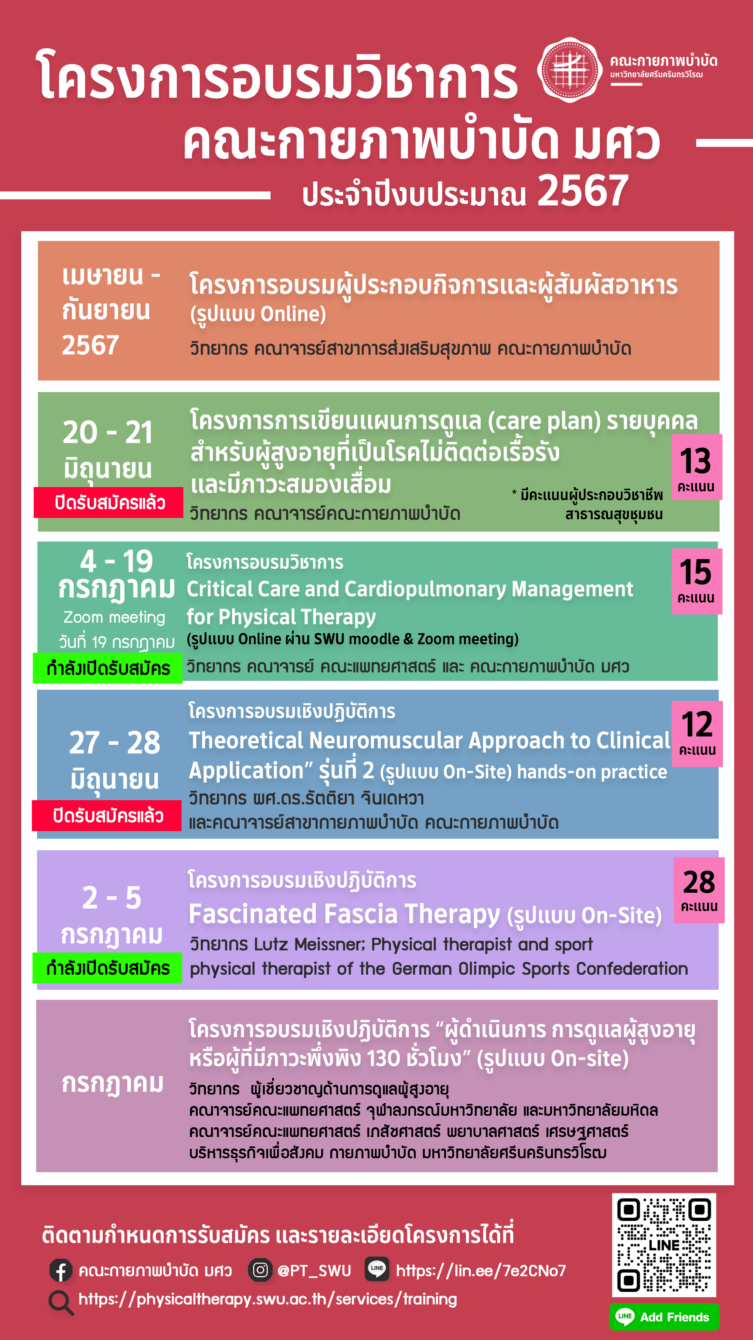 คณะกายภาพบำบัด มีการจัดอบรมวิชาการในสาขากายภาพบำบัด โดยมีเป้าหมายเพื่อเพิ่มพูนความรู้ ประสบการณ์ใหม่ๆ ให้แก่ครู อาจารย์ นักวิจัย ผู้ประกอบวิชาชีพในสาขาวิชากายภาพบำบัด นักส่งเสริมสุขภาพ นักวิชาการสาธารณสุข และบุคคลทั่วไป ซึ่งในปีงบประมาณ 2567 คณะกายภาพบำบัด มศว ได้จัดโครงการอบรมดังนี้