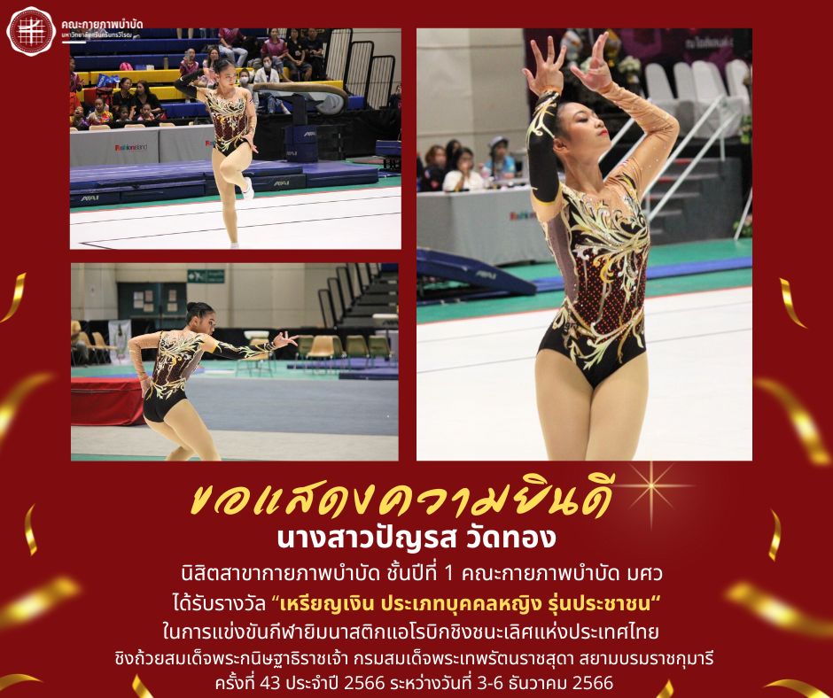 คณะกายภาพบำบัด มศว ได้รับรางวัล “เหรียญเงิน ประเภทบุคคลหญิง รุ่นประชาชน“ ในการแข่งขันกีฬายิมนาสติกแอโรบิกชิงชนะเลิศแห่งประเทศไทย ชิงถ้วยสมเด็จพระกนิษฐาธิราชเจ้า กรมสมเด็จพระเทพรัตนราชสุดา