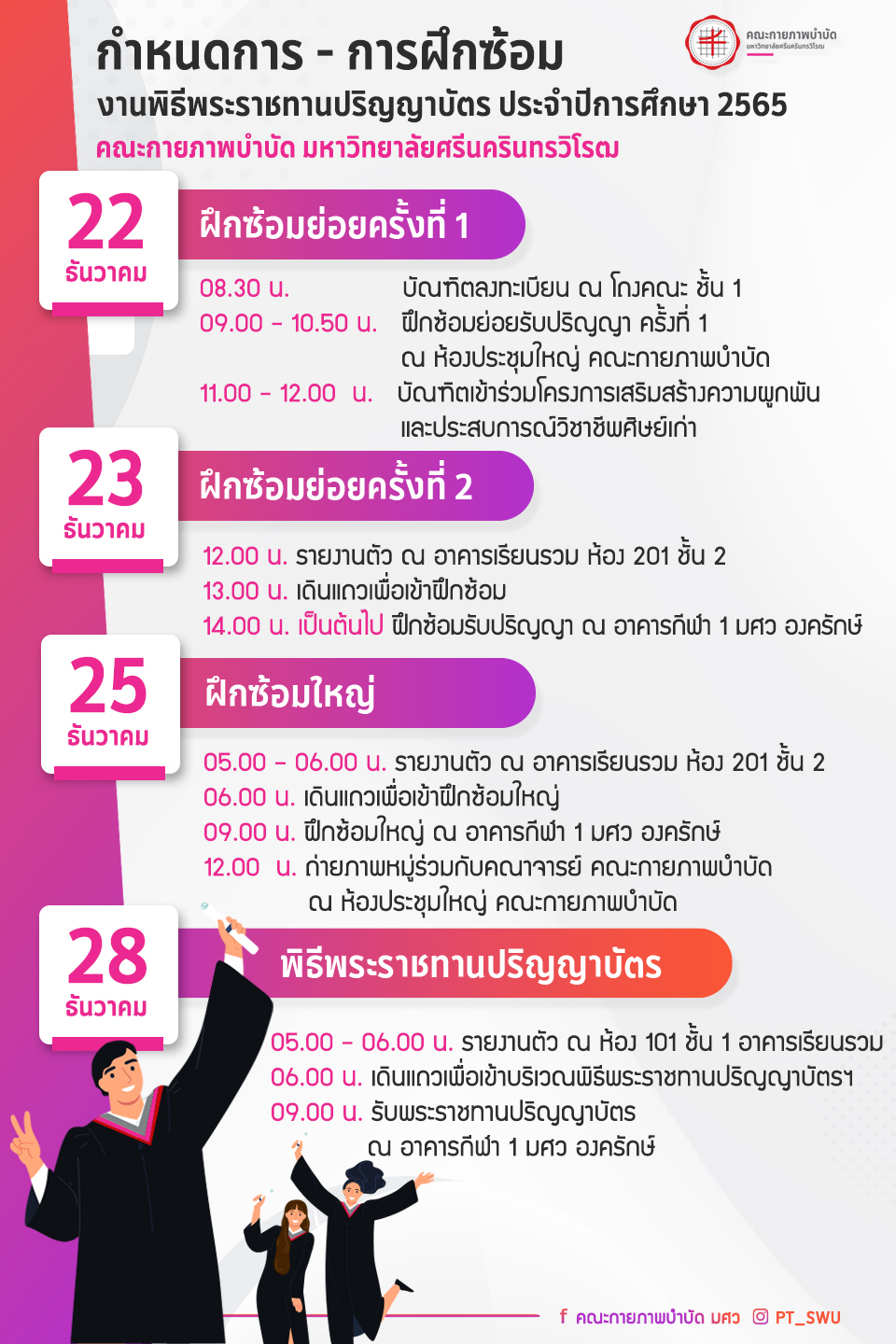 ข่าวประชาสัมพันธ์ กำหนดการ-การฝึกซ้อมงานพิธีพระราชทานปริญญาบัตร ประจำปีการศึกษา 2565คณะกายภาพบำบัด มหาวิทยาลัยศรีนครินทรวิโรฒ วันเริ่ม 2023-12-19