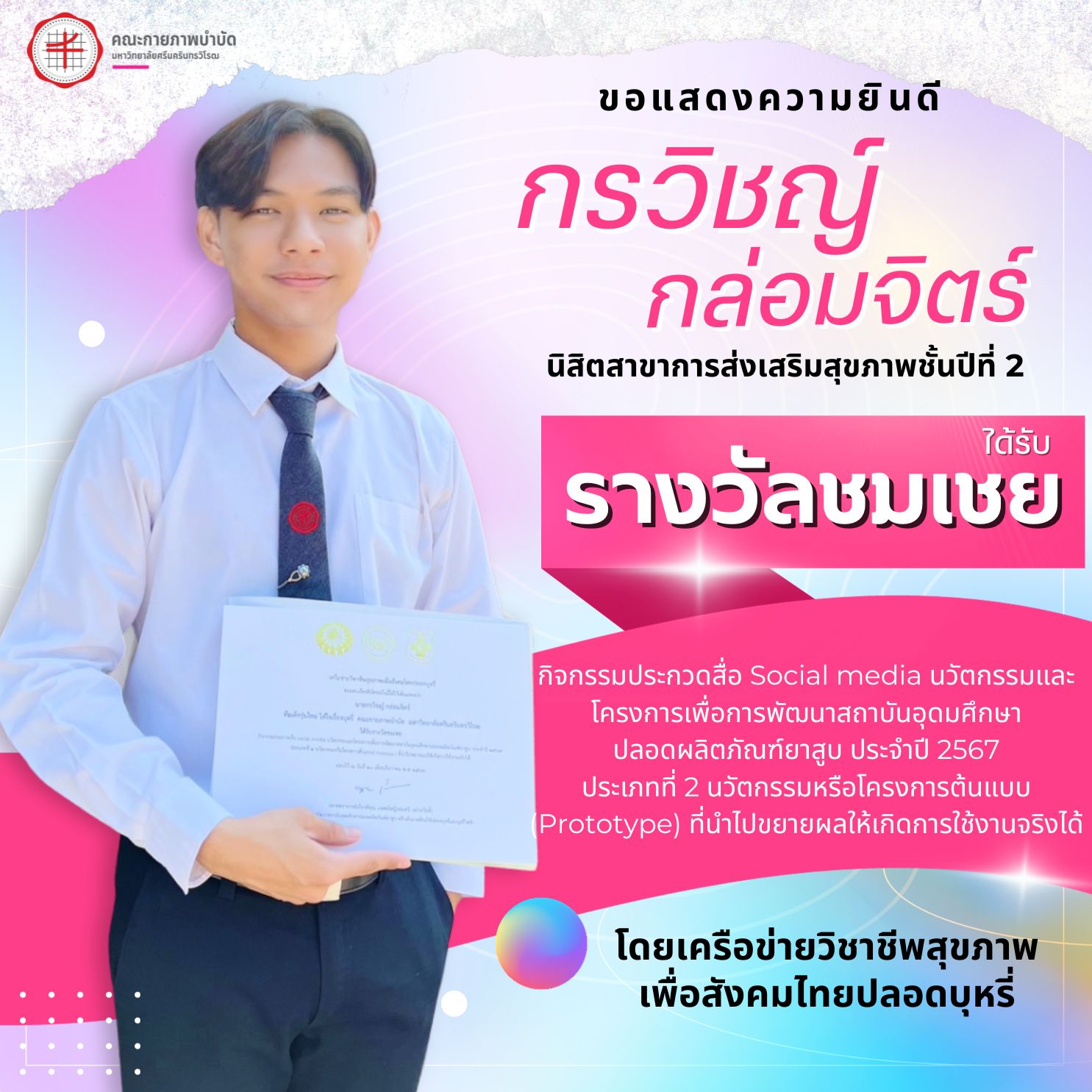 กรวิชญ์ กล่อมจิตร์ นิสิตสาขาการส่งเสริมสุขภาพ ชั้นปีที่ 2 คณะกายภาพบำบัด มศว ที่ได้รับ "รางวัลชมเชย" กิจกรรมประกวดสื่อ Social media นวัตกรรมและโครงการเพื่อการพัฒนาสถาบันอุดมศึกษาปลอดผลิตภัณฑ์ยาสูบ ประจำปี 2567 ประเภทที่ 2 นวัตกรรมหรือโครงการต้นแบบ (Prototype) ที่นำไปขยายผลให้เกิดการใช้งานจริงได้ โดยเครือข่ายวิชาชีพสุขภาพเพื่อสังคมไทยปลอดบุหรี่