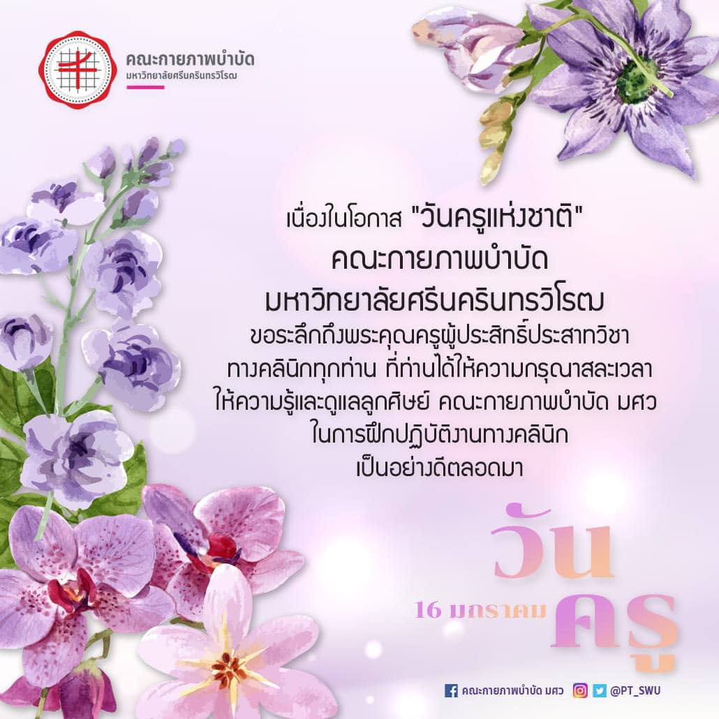 คณะกายภาพบำบัด มหาวิทยาลัยศรีนครินทรวิโรฒ ขอระลึกถึงพระคุณครูผู้ประสิทธิ์ประสาทวิชาทางคลินิกทุกท่าน ที่ท่านได้ให้ความกรุณาสละเวลา ให้ความรู้และดูแลลูกศิษย์ คณะกายภาพบำบัด มศว ในการฝึกปฏิบัติงานทางคลินิกเป็นอย่างดีตลอดมา