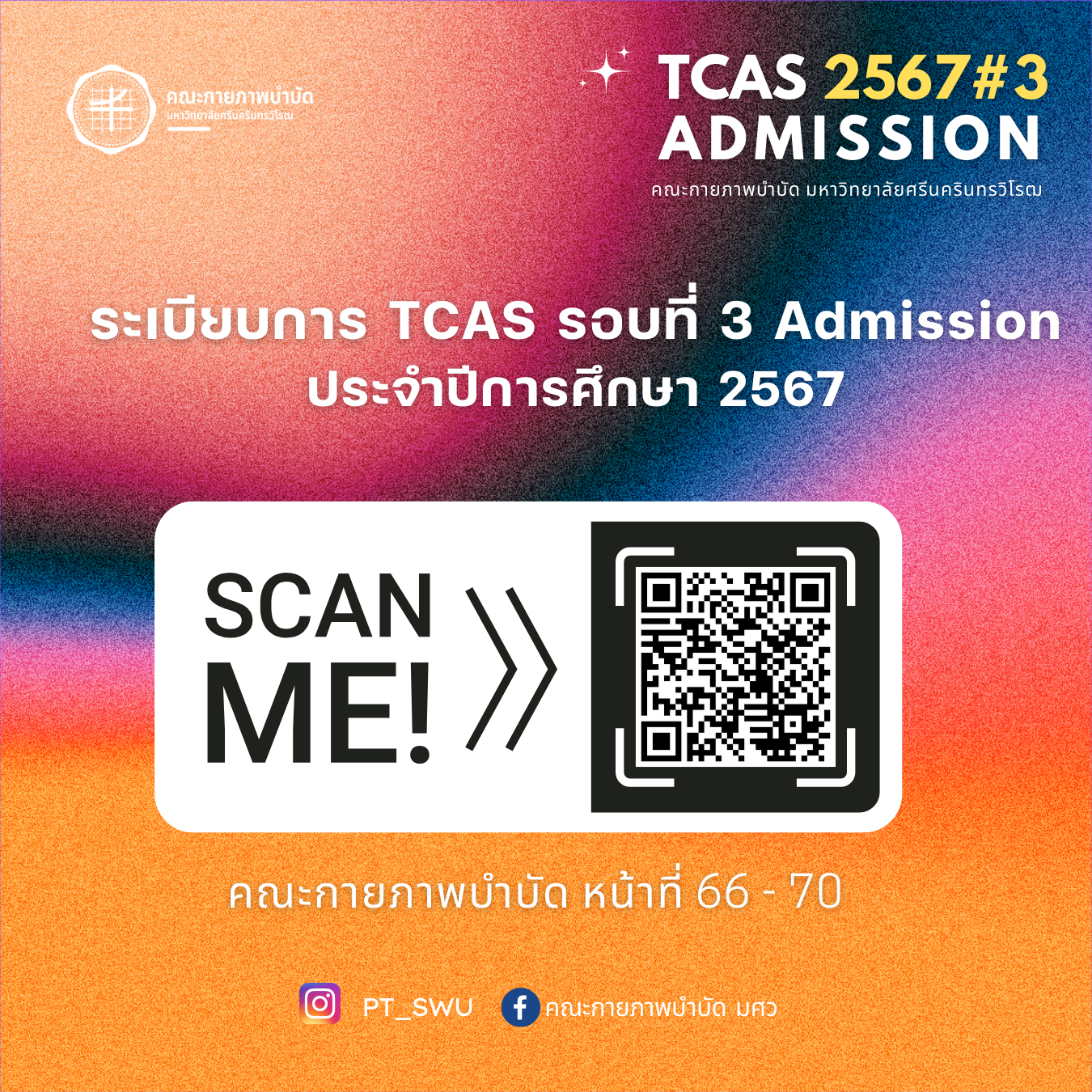ข่าวประชาสัมพันธ์ TCAS รอบที่ 3 [ ADMISSION ] รอบสุดท้ายสำหรับ #dek67คณะกายภาพบำบัด มศว เปิดรับนิสิตระดับปริญญาตรี สาขากายภาพบำบัด รับ 37 คน สาขาการส่งเสริมสุขภาพ รับ 30 คน สาขากิจกรรมบำบัด รับ 5 คน ดูรายละเอียดได้ทาง : https://admission.swu.ac.th/admissions2/news_content.php?nid=693 เปิดรับสมัคร 6 - 12 พฤษภาคม 2567 เปิดรับสมัครทาง https://www.mytcas.com/.#TCAS67 #SWU #ทีมมศว#กายภาพบำบัด #การส่งเสริมสุขภาพ #กิจกรรมบำบัด วันเริ่ม 2024-04-25 PreviousNext