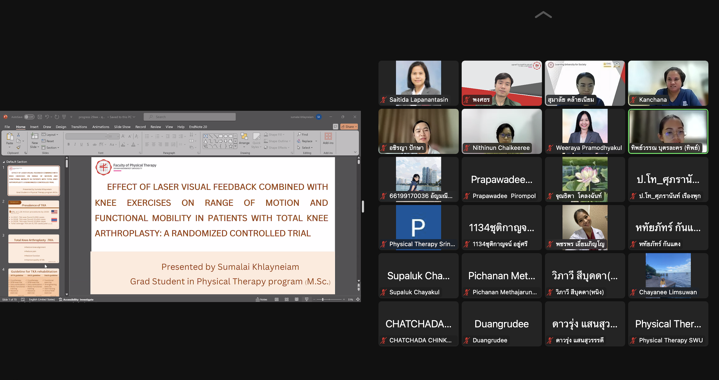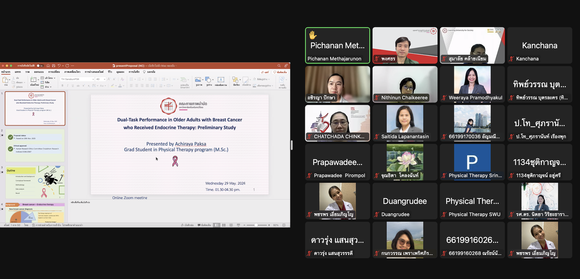 วันที่ 29 พฤษภาคม 2567 ทางหลักสูตรระดับบัณฑิตศึกษา คณะกายภาพบำบัด มหาวิทยาลัยศรีนคริทรวิโรฒ ได้จัดโครงการ “แลกเปลี่ยนประสบการณ์วิจัย” โดยนิสิตได้แลกเปลี่ยนเรียนรู้นำเสนอประสบการณ์วิจัย ปัญหาและอุปสรรคในการเรียน การทำวิจัย รวมถึงแนวทางการแก้ไข เพื่อพัฒนาปริญญานิพนธ์และสารนิพนธ์