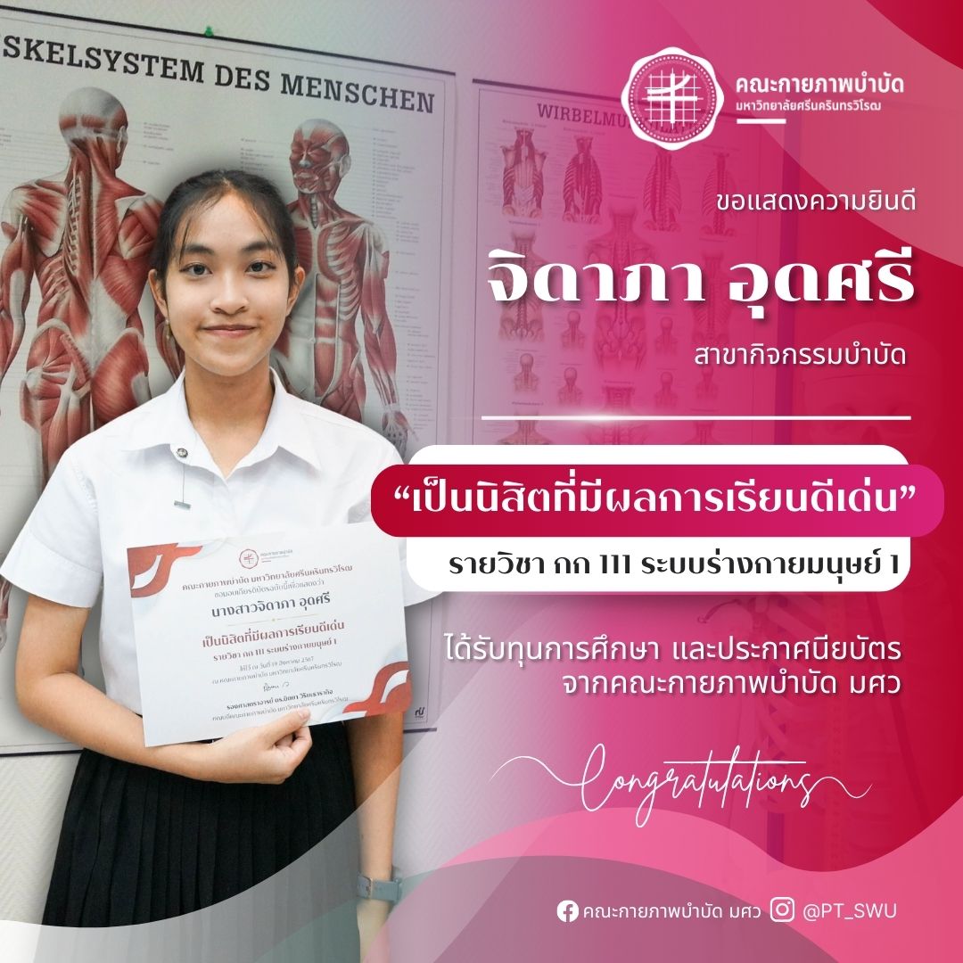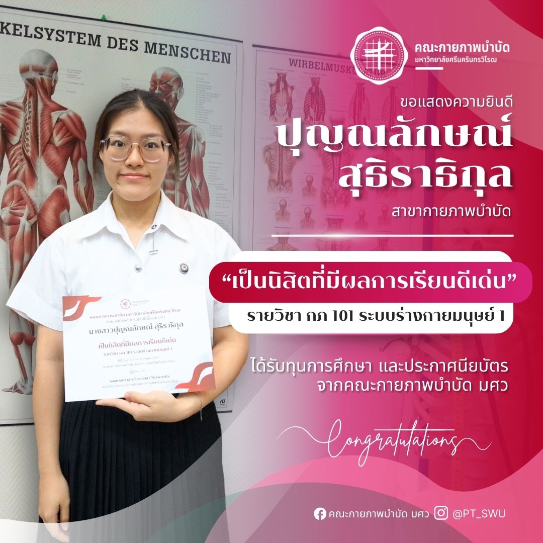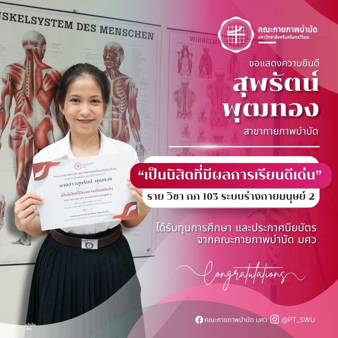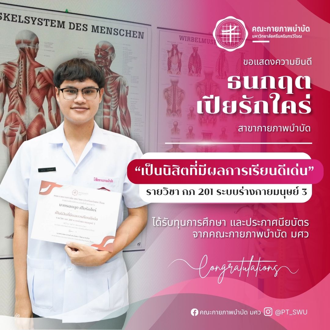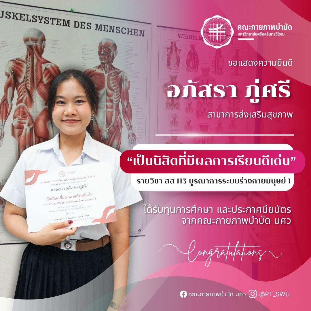 ข่าวประชาสัมพันธ์ ขอแสดงความยินดี นิสิตคณะกายภาพบำบัด มศว ที่มีผลการเรียนดีเด่นในรายวิชาระบบร่างกายมนุษย์ ได้รับทุนการศึกษา และประกาศนียบัตรจากคณะกายภาพบำบัด มศว#PTSWU #HPSWU #OTSWU#ทีมมศว #คณะกายภาพบำบัดมศว วันเริ่ม 2024-08-20 PreviousNext