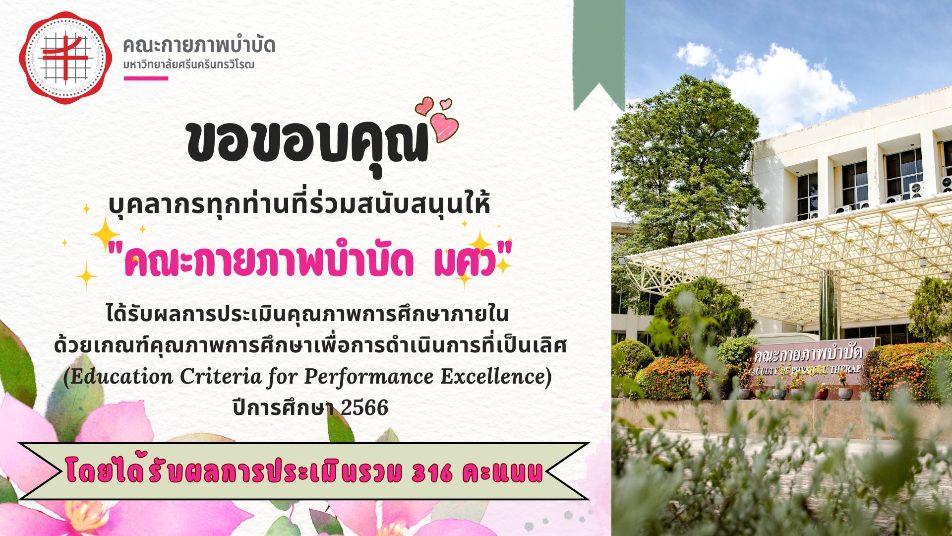 ขอขอบคุณบุคลากรทุกท่านที่ร่วมสนับสนุนให้ "คณะกายภาพบำบัด มศว" ได้รับผลการประเมินคุณภาพการศึกษาภายใน ด้วยเกณฑ์คุณภาพการศึกษาเพื่อการดำเนินการที่เป็นเลิศ (Education Criteria for Performance Excellence) ปีการศึกษา 2566 โดยได้รับผลการประเมินรวม 316 คะแนน