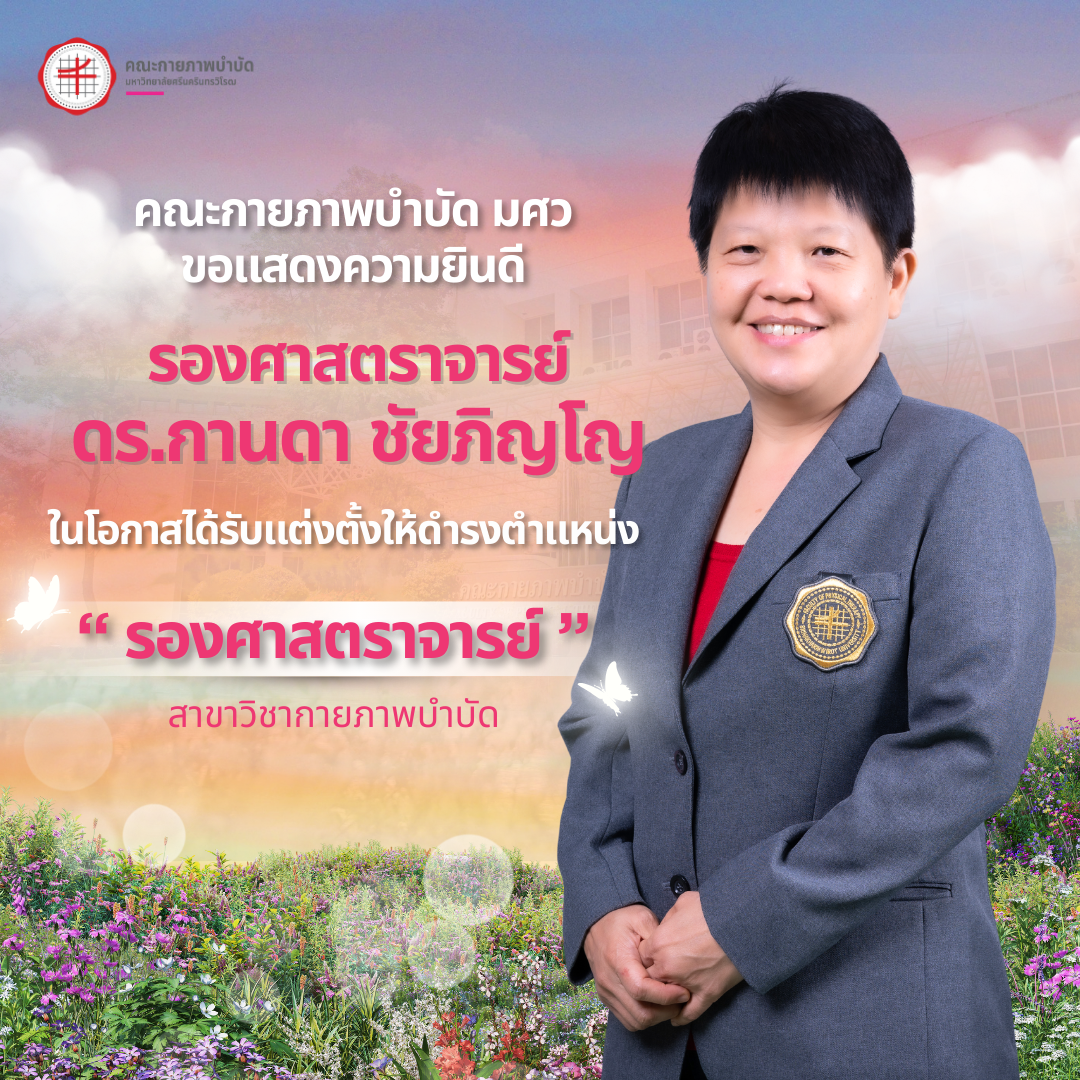 ข่าวประชาสัมพันธ์ คณะกายภาพบำบัด มศว ขอแสดงความยินดีกับรองศาสตราจารย์ ดร.กานดา ชัยภิญโญในโอกาสได้รับแต่งตั้งให้ดำรงตำแหน่ง "รองศาสตราจารย์" วันเริ่ม 2024-10-08