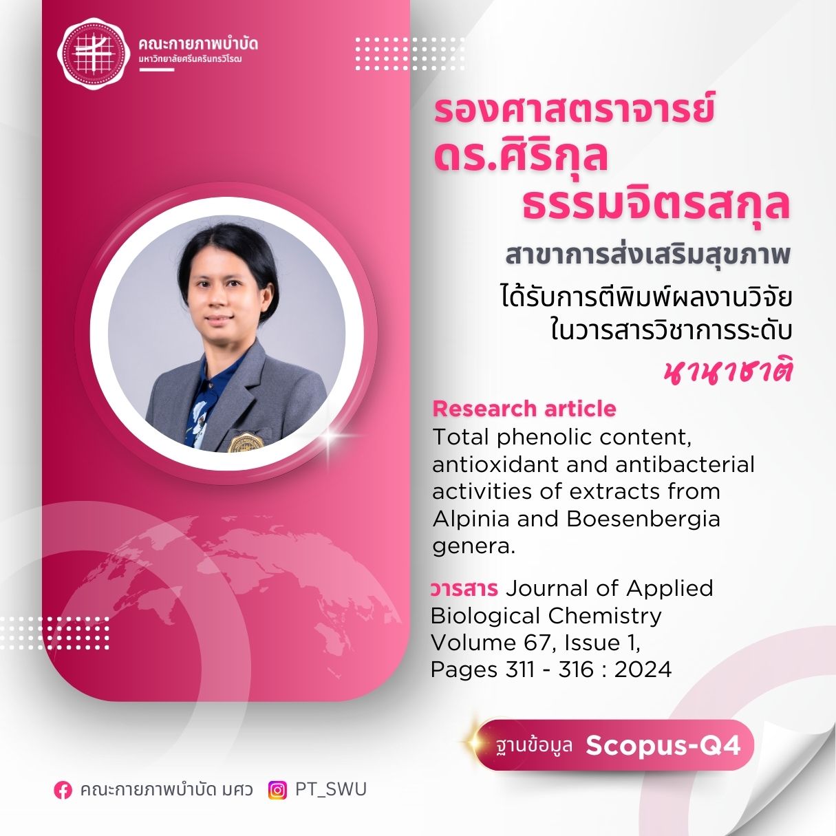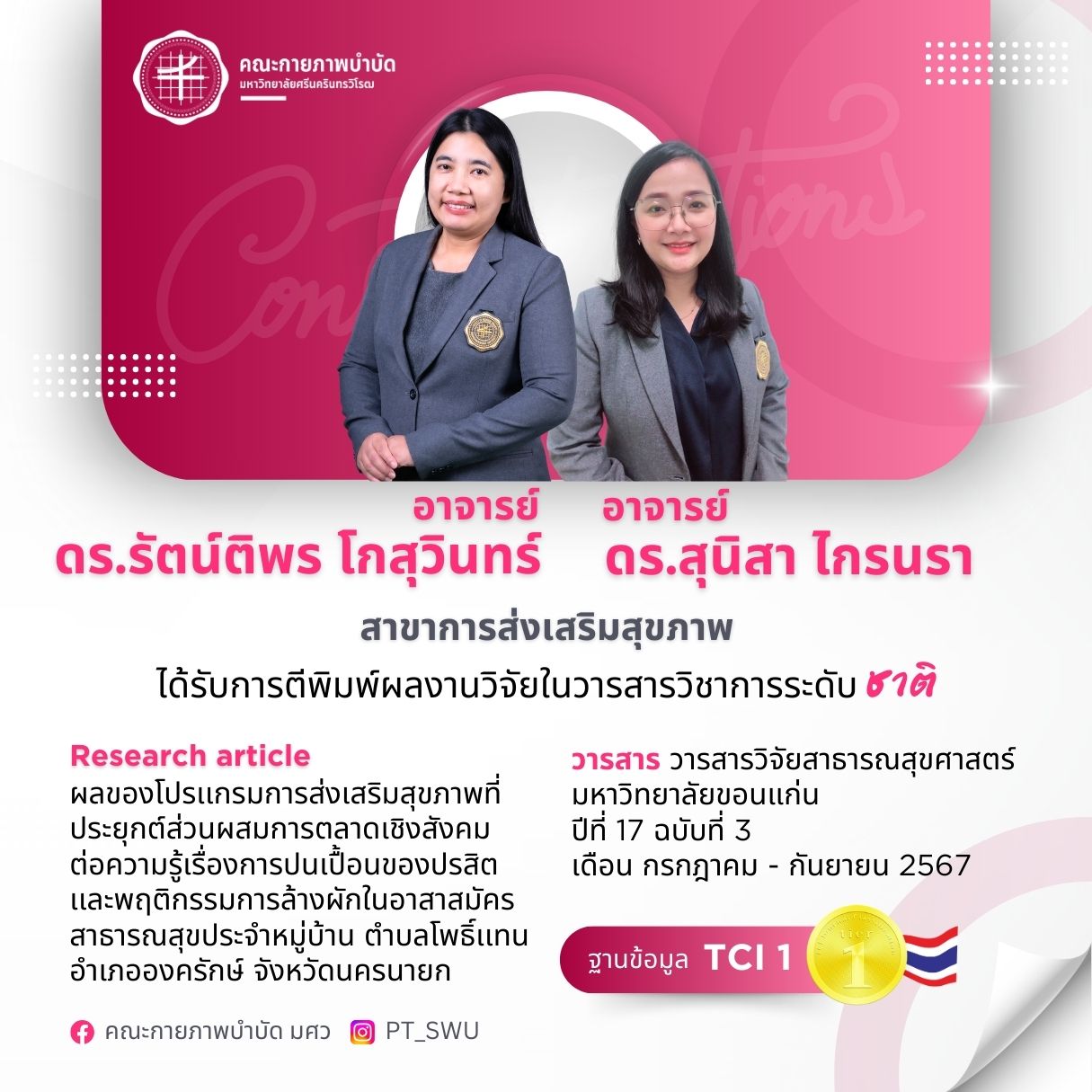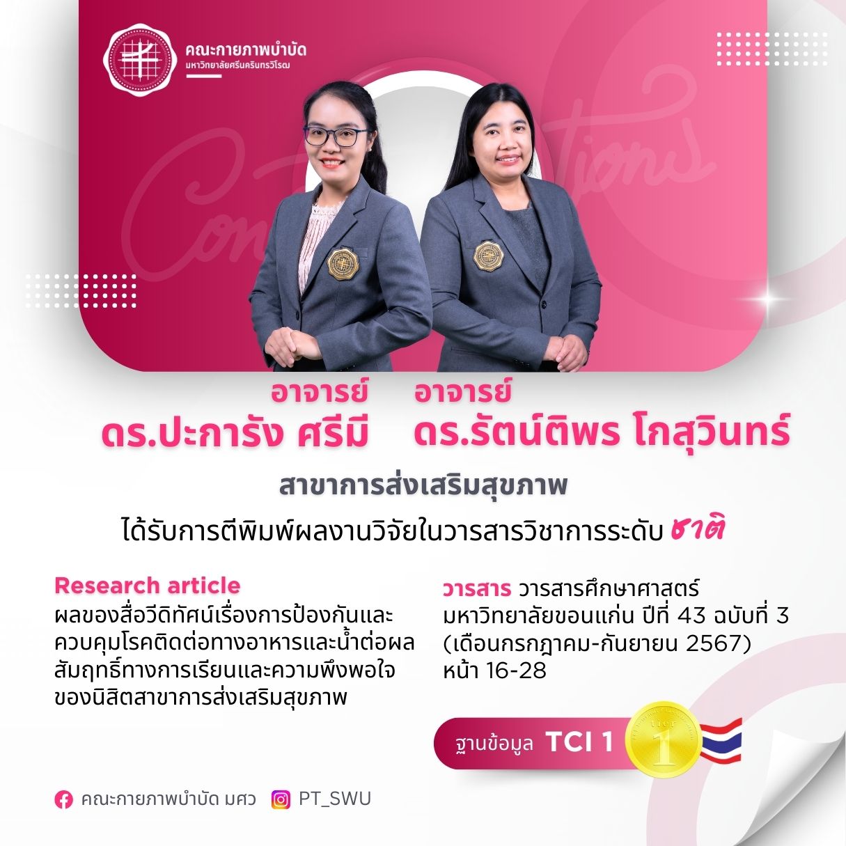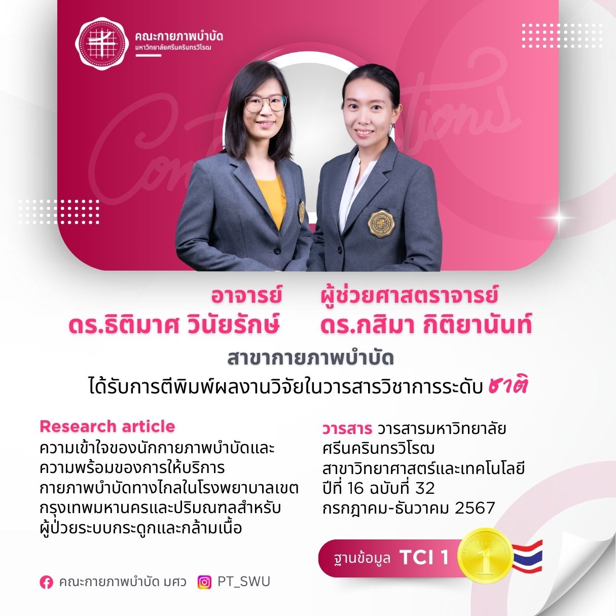 ข่าวประชาสัมพันธ์ คณะกายภาพบำบัด มศว ขอแสดงความยินดีกับ คณาจารย์คณะกายภาพบำบัด มศว ที่ได้รับการตีพิมพ์ผลงานวิจัยในระดับชาติ และนานาชาติ (เดือนตุลาคม 2567) วันเริ่ม 2024-11-06 PreviousNext