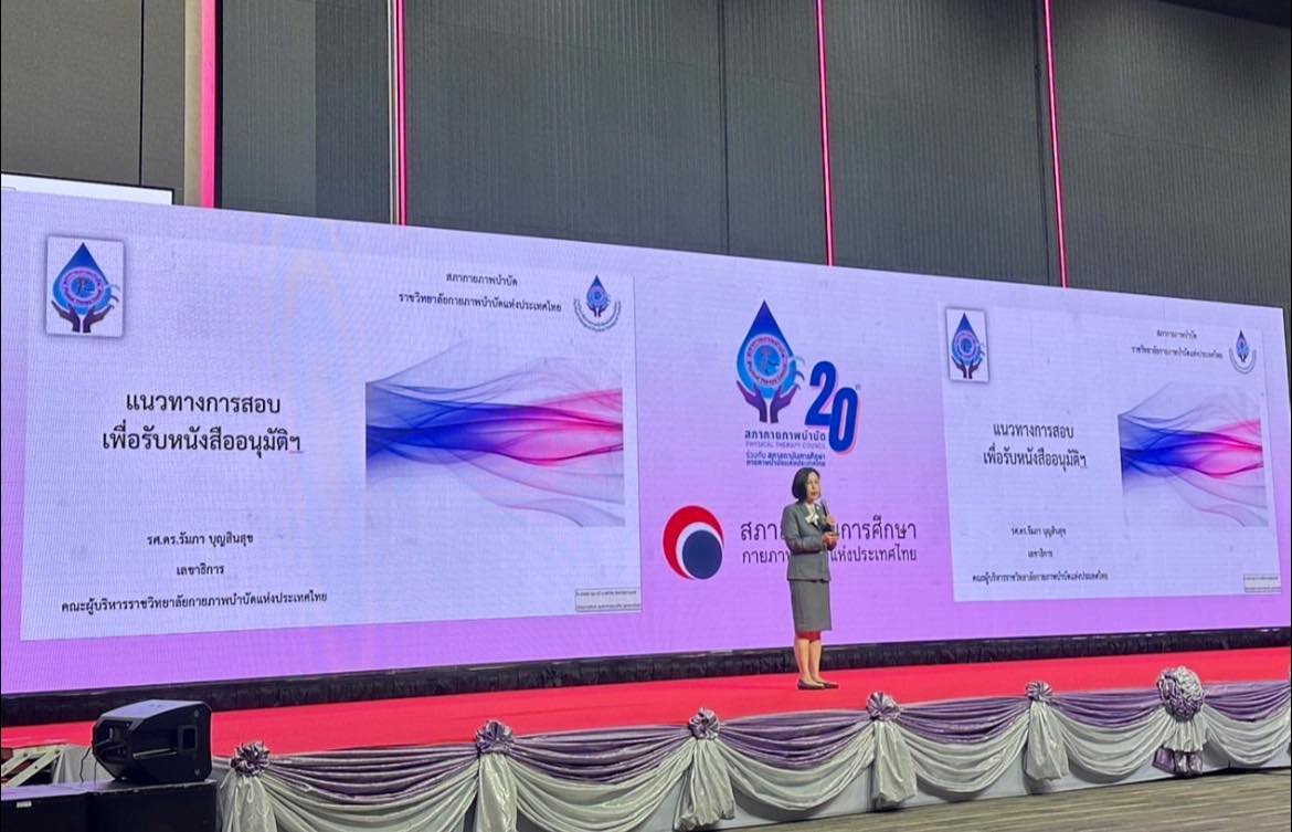 รศ.ดร.รัมภา บุญสินสุข ผู้อำนวยการสถาบันยุทธศาสตร์ทางปัญญาและวิจัย มศว และอาจารย์สาขากายภาพบำบัด มศว ได้รับเชิญในฐานะเลขาธิการ ราชวิทยาลัยกายภาพบำบัดแห่งประเทศไทย ให้กล่าวบรรยายเริ่มงานประชุมวิชาการกายภาพบำบัดในโอกาสที่สภากายภาพบำบัดครบรอบ 20 ปี ในหัวข้อ แนวทางการสอบเพื่อขอรับหนังสืออนุมัติแสดงความรู้ความชำนาญในการประกอบวิชาชีพกายภาพบำบัดสาขาต่างๆ เมื่อวันที่ 21 พฤศจิกายน 2567