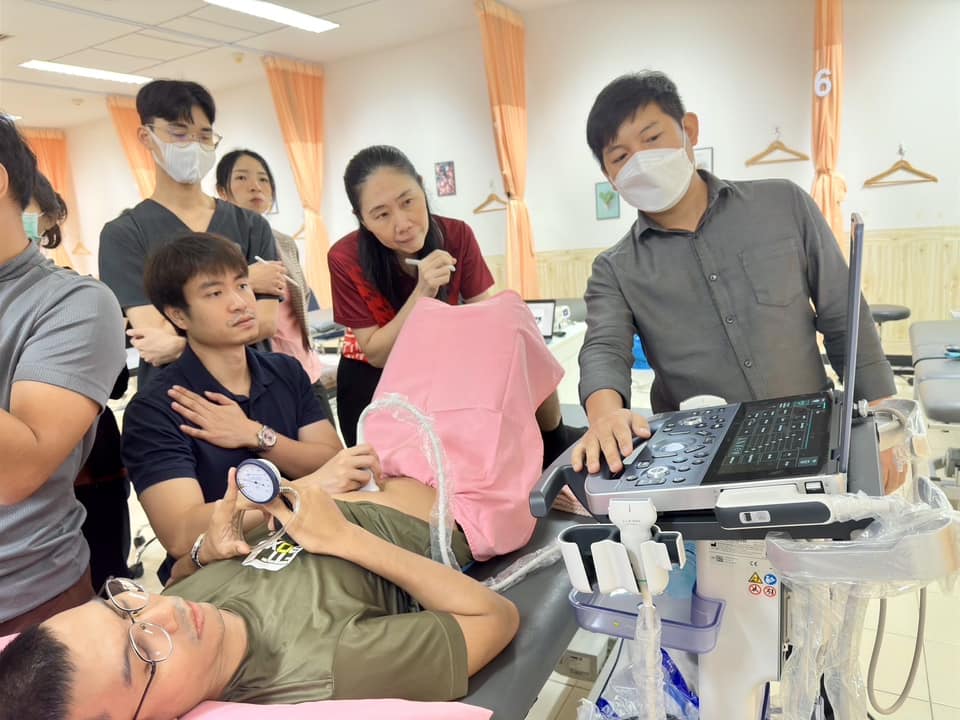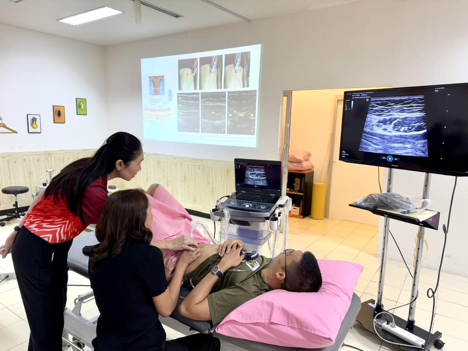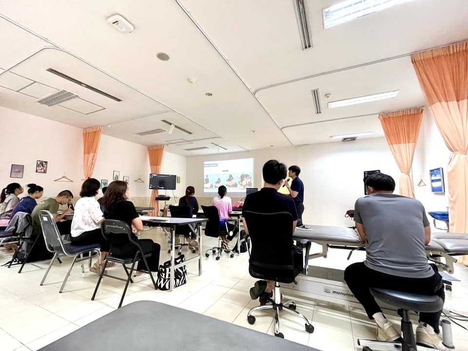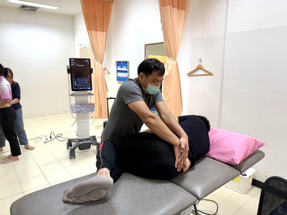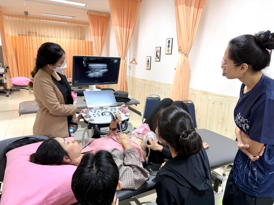 บรรยากาศการเรียนการสอนรายวิชา กภ 616 การรักษาด้วยมือและการเคลื่อนไหว (Manual and movement therapy) สำหรับนิสิตบัณฑิตศึกษา สาขากายภาพบำบัด นิสิตได้เรียนรู้ถึงการใช้ Ultrasound imaging ในส่วนของกล้ามเนื่อลำตัว และการใช้ redcord neurac method ในการประยุกต์การออกกำลังกายสำหรับฝึกความมั่นคงของลำตัว (trunk stabilization) เมื่อวันที่ 24 พฤศจิกายน 2567