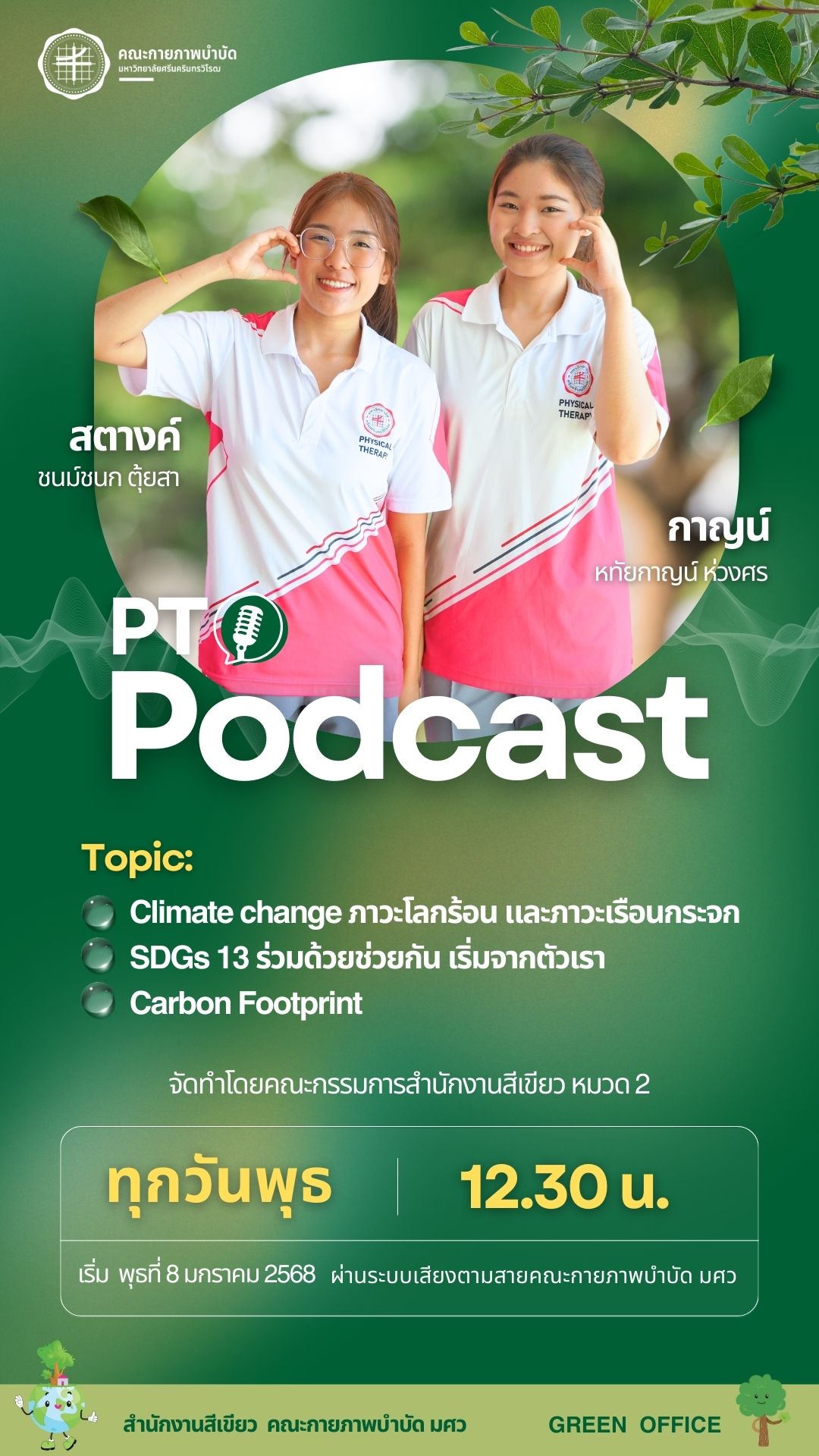 ข่าวประชาสัมพันธ์ คณะกรรมการสำนักงานสีเขียว หมวด 2 ขอเชิญทุกท่านรับฟัง "PT Podcast" Topic: Climate change ภาวะโลกร้อน และภาวะเรือนกระจก SDGs 13 ร่วมด้วยช่วยกัน เริ่มจากตัวเรา Carbon Footprintทุกวันพุธ เวลา 12.30 น. เริ่มวันพุธที่ 8 ม.ค. 68 ผ่านระบบเสียงตามสายคณะกายภาพบำบัด มศว #สำนักงานสีเขียว วันเริ่ม 2025-01-06