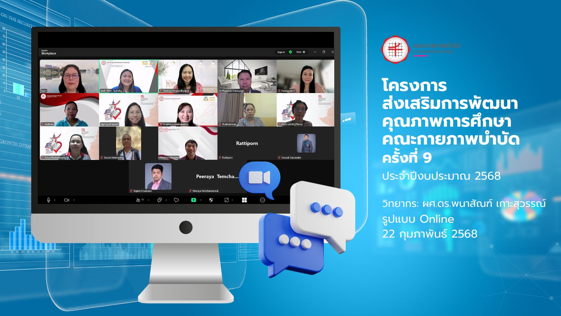 กิจกรรม โครงการ ส่งเสริมการพัฒนาคุณภาพการศึกษา คณะกายภาพบำบัด ครั้งที่ 9 ประจำปีงบประมาณ 2568 รูปแบบ Online วันที่ 22 กุมภาพันธ์ 2568วิทยากร: ผศ.ดร.พนาสัณฑ์ เกาะสุวรรณ์ วันเริ่ม 2025-02-24
